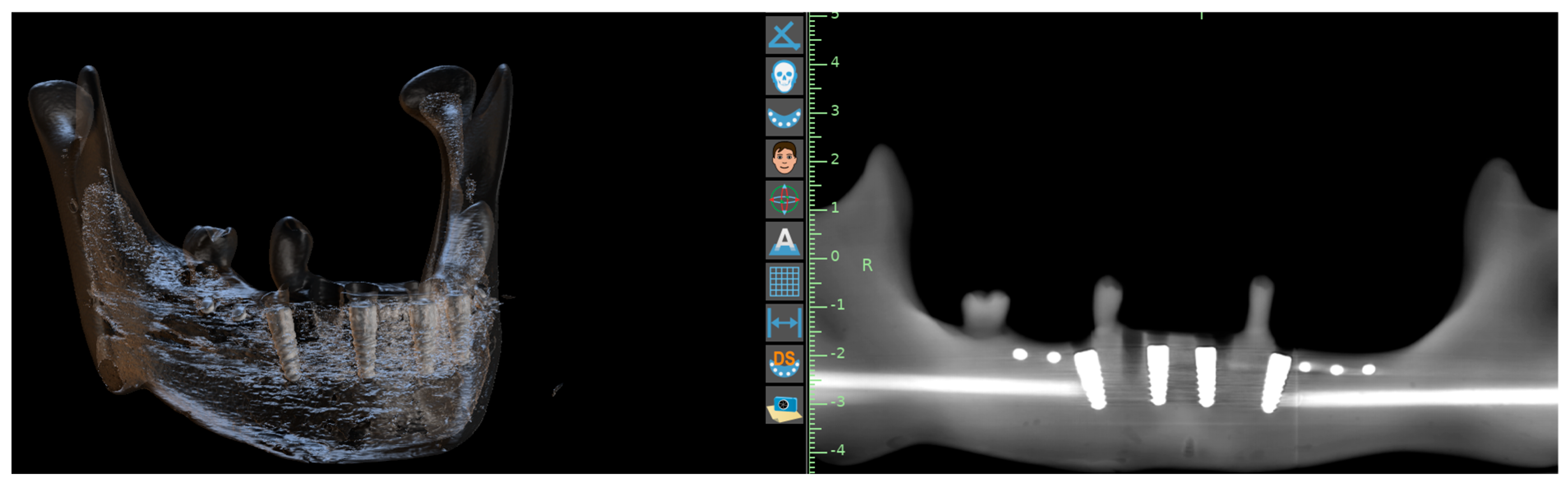 - Wu, V.; Schulten, E.A.; Helder, M.N.; Ten Bruggenkate, C.M.; Bravenboer, N.; Klein-Nulend, J. Immediate flapless full-arch rehabilitation of edentulous jaws on 4 or 6 implants according to the prosthetic-driven planning and guided implant surgery: A retrospective study on clinical and radiographic outcomes up to 10 years of follow-up. Clin. Implant. Dent. Relat. Res. 2022, 24, 831–844. [Google Scholar] [CrossRef]