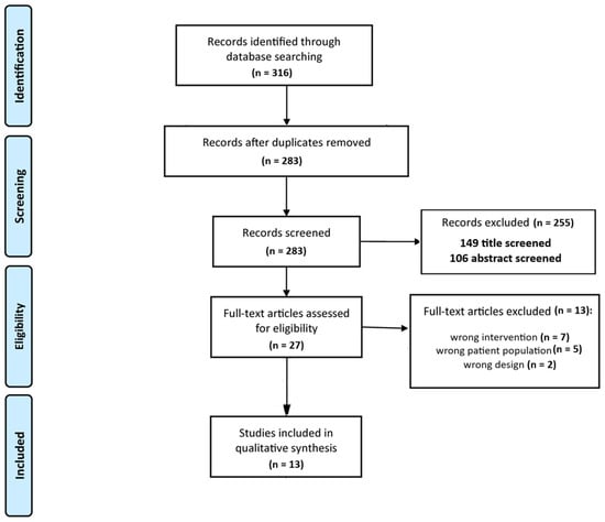 The literature search yielded 316 results, of which 33 duplicates were removed. After screening 283 titles and abstracts, 255 studies were excluded. Full texts of 27 articles were assessed, of which 13 were excluded: 5 for not meeting the study population inclusion criteria, 2 for inappropriate study design, and 7 for unsuitable interventions. 13 articles met all the required eligibility criteria and were included in the review [31,32,33,34,35,36,37,38,39,40,41,42,43]. The PRISMA flow diagram of the study is presented in Figure 1.