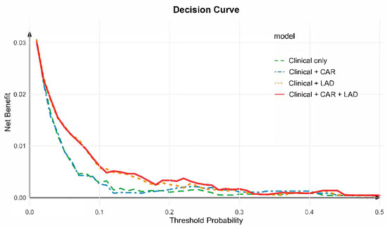 Decision curve analysis (DCA) was performed to evaluate the net clinical benefit of adding CAR and LAD to the conventional clinical model. As shown in Figure 5, across a wide range of threshold probabilities, models incorporating CAR + LAD yielded greater net benefit than the clinical model alone. The combined model consistently provided the highest overall net benefit, followed by the Clinical + LAD and Clinical + CAR models, whereas the clinical-only model showed the lowest utility. These findings indicate that incorporating both CAR and LAD can improve individualized risk stratification and clinical decision-making for NOAF prediction.
