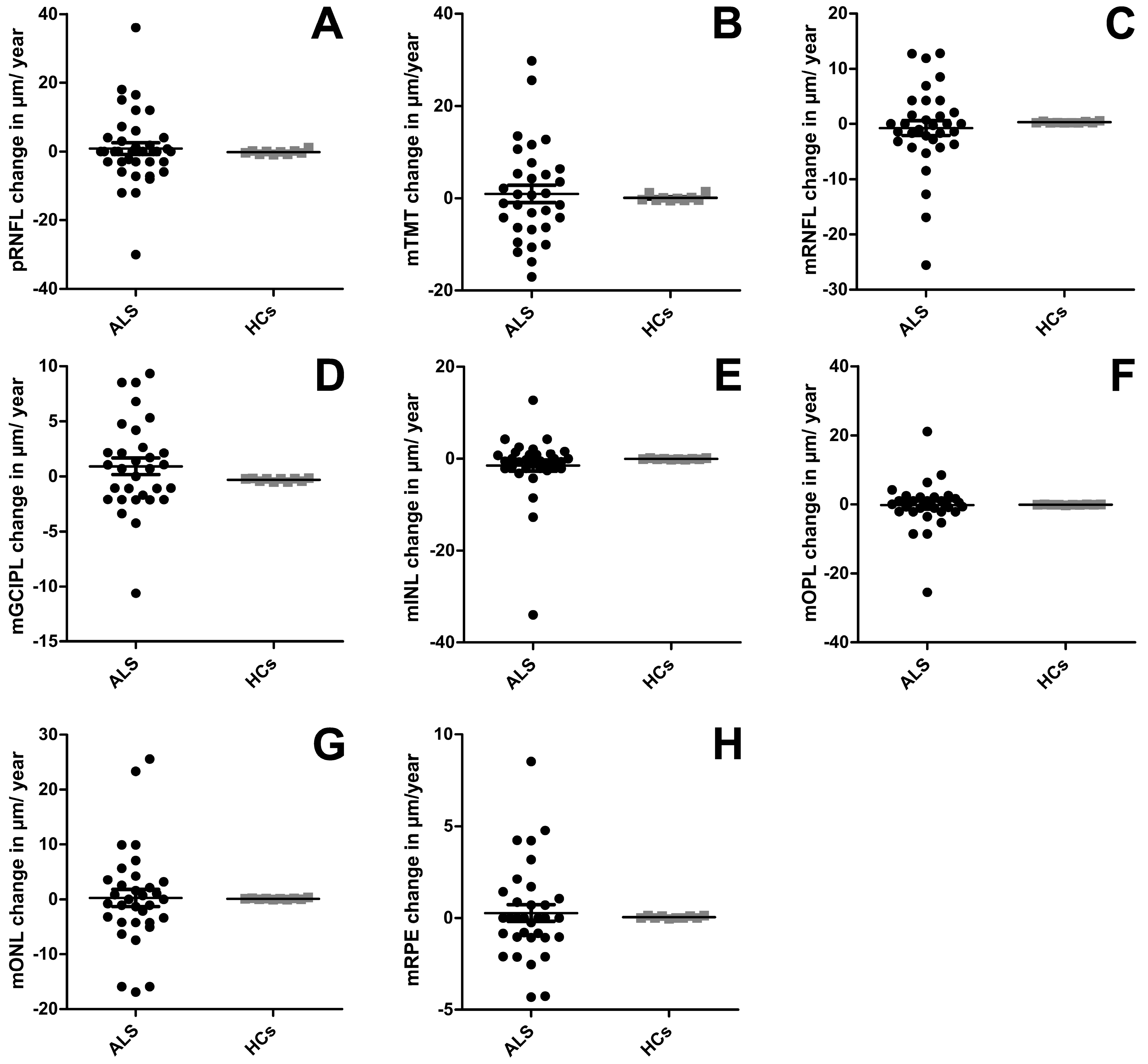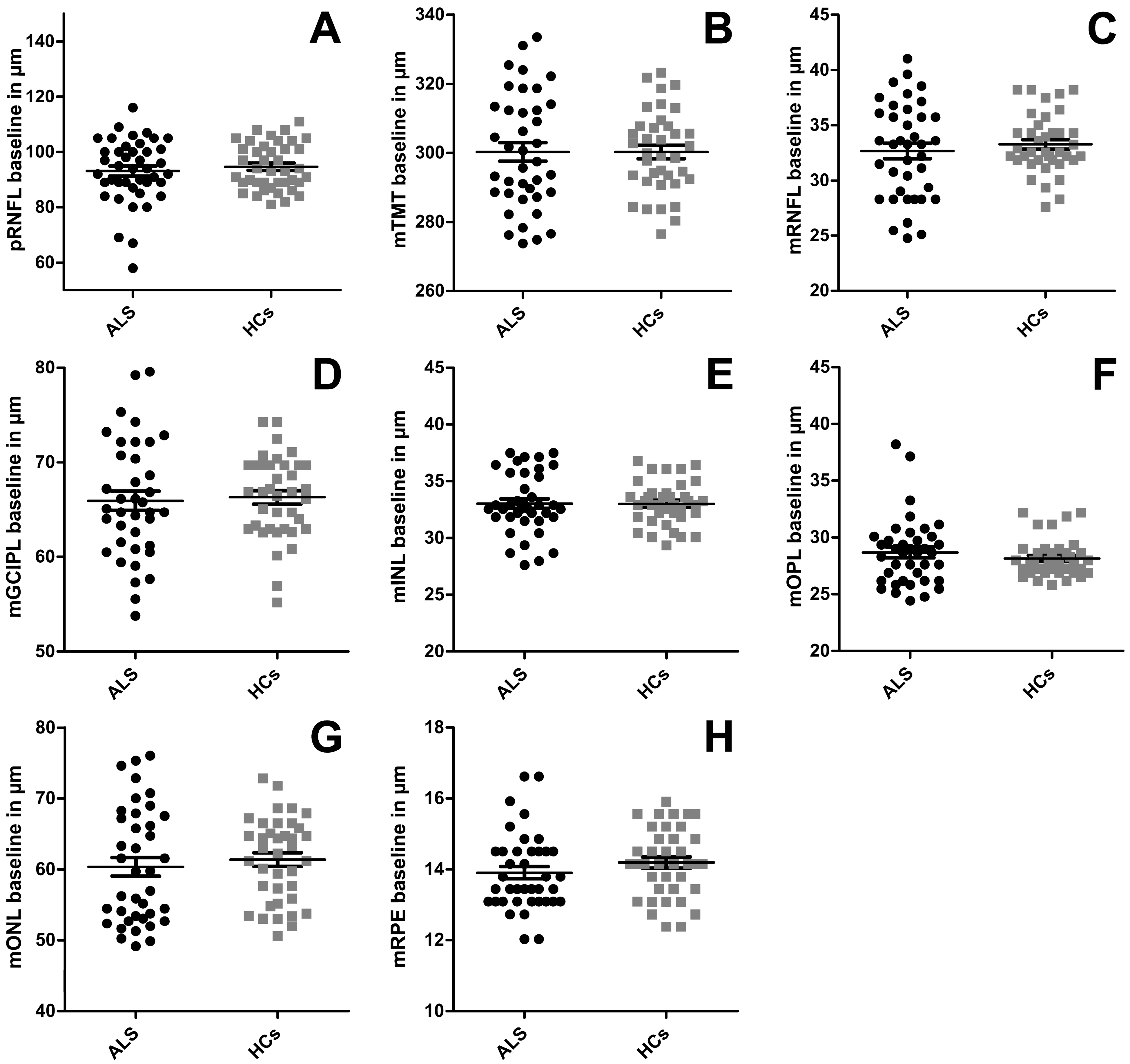 | OCT Layer, µm a | ALS | HCs | Statistics: ALS vs. HC |