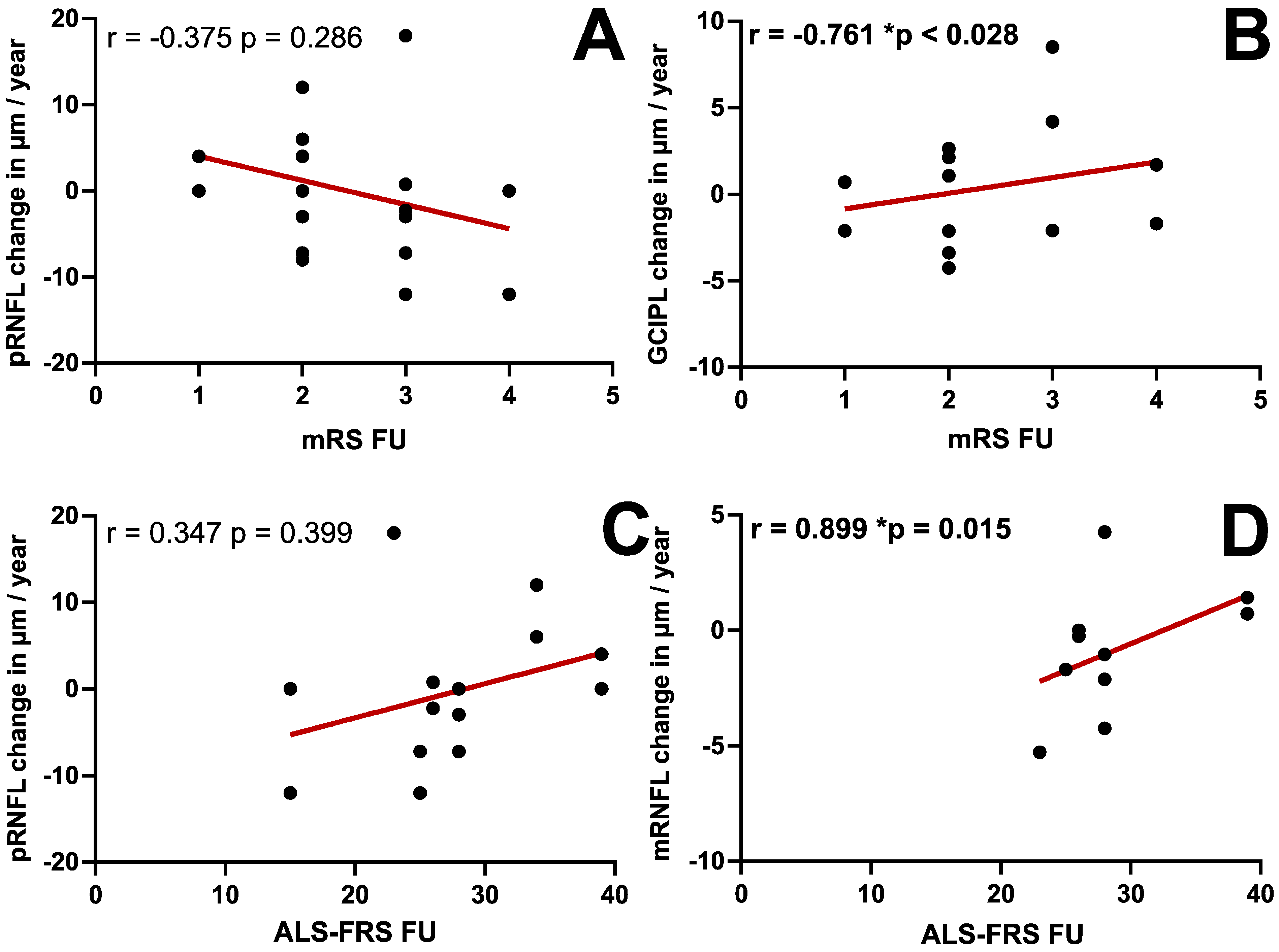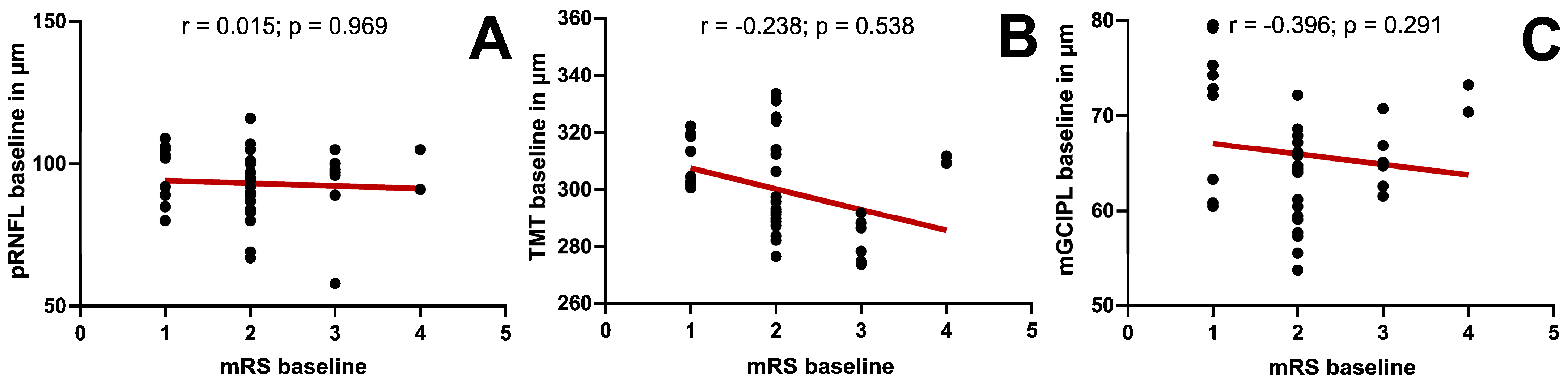| OCT-Parameter, µm | mRS (n = 22) | BI (n = 9) | ALSFRS-R (n = 6) |