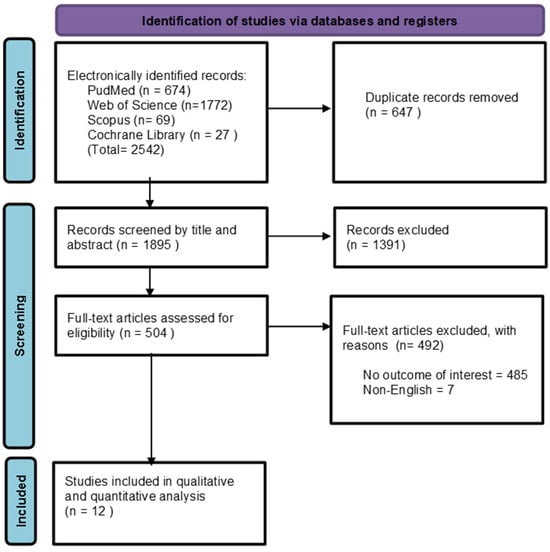 Two independent reviewers conducted this process using Rayyan software v1.5.6 [15]. First, titles and abstracts were screened to exclude irrelevant articles based on the predefined eligibility criteria and duplicate record removal. Subsequently, full-text screening of potentially eligible studies was performed. Any conflicts were resolved through discussion. Our initial search yielded a total of 2542 records. After removing duplicates, 1895 records remained. Following title and abstract screening, 1391 records were eliminated. Subsequently, 504 full-text articles were assessed for eligibility. Ultimately, only 12 articles met the inclusion criteria (Figure 1).