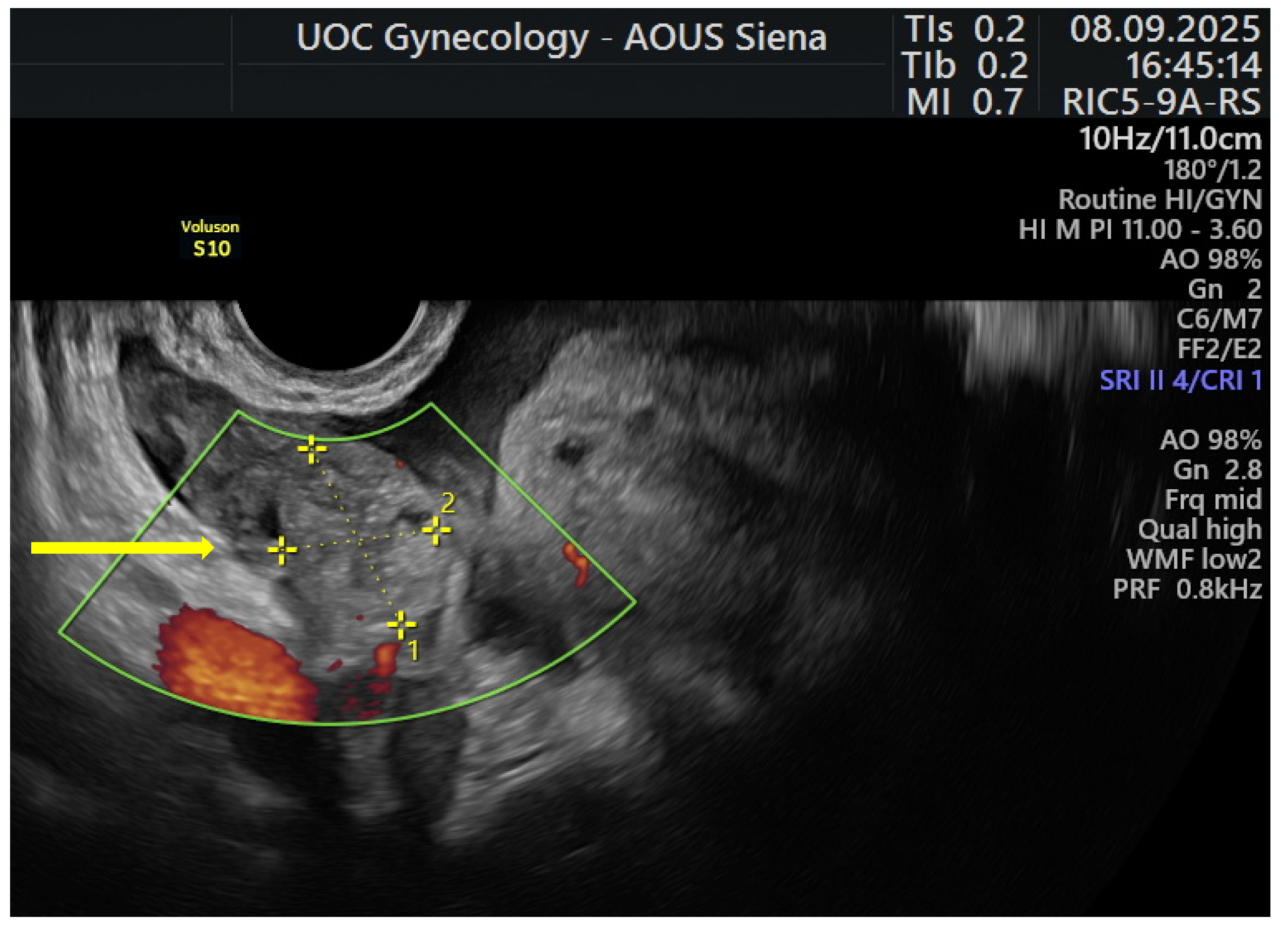- Nocita, E.; Martire, F.G.; Paladino, C.; Monaco, G.; Iacobini, F.; Valeriani, S.; Soreca, G.; Russo, C.; Exacoustos, C. Ultrasound Follow-Up in young women with severe dysmenorrhea predicts early onset of endometriosis. J. Gynecol. Obstet. Hum. Reprod. 2025, 54, 103003. [Google Scholar] [CrossRef]