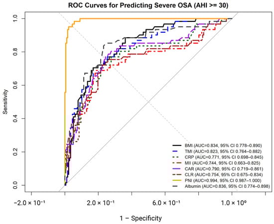 Among inflammation-related biomarkers, CRP, MII, CAR, and CLR demonstrated moderate diagnostic accuracy, with AUC values ranging from 0.744 to 0.791 (all p < 0.001). Optimal cut-off values for these markers yielded sensitivities ranging from 68.9% to 77.0% and specificities ranging from 75.7% to 81.4%, with all corresponding chi-square tests indicating significant associations with severe OSA (all p < 0.001).
