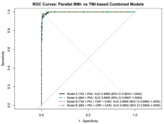 Similarly, Model B, which additionally incorporated inflammatory markers (CRP and CAR), yielded very high discriminatory ability in both formulations (TMI-based AUC = 0.9985; BMI-based AUC = 0.9982), with no significant difference between anthropometric indices. For both model structures, TMI-based and BMI-based formulations demonstrated comparable discriminative performance when combined with nutritional and inflammatory biomarkers. The addition of inflammatory markers in Model B did not result in a statistically significant improvement over Model A.