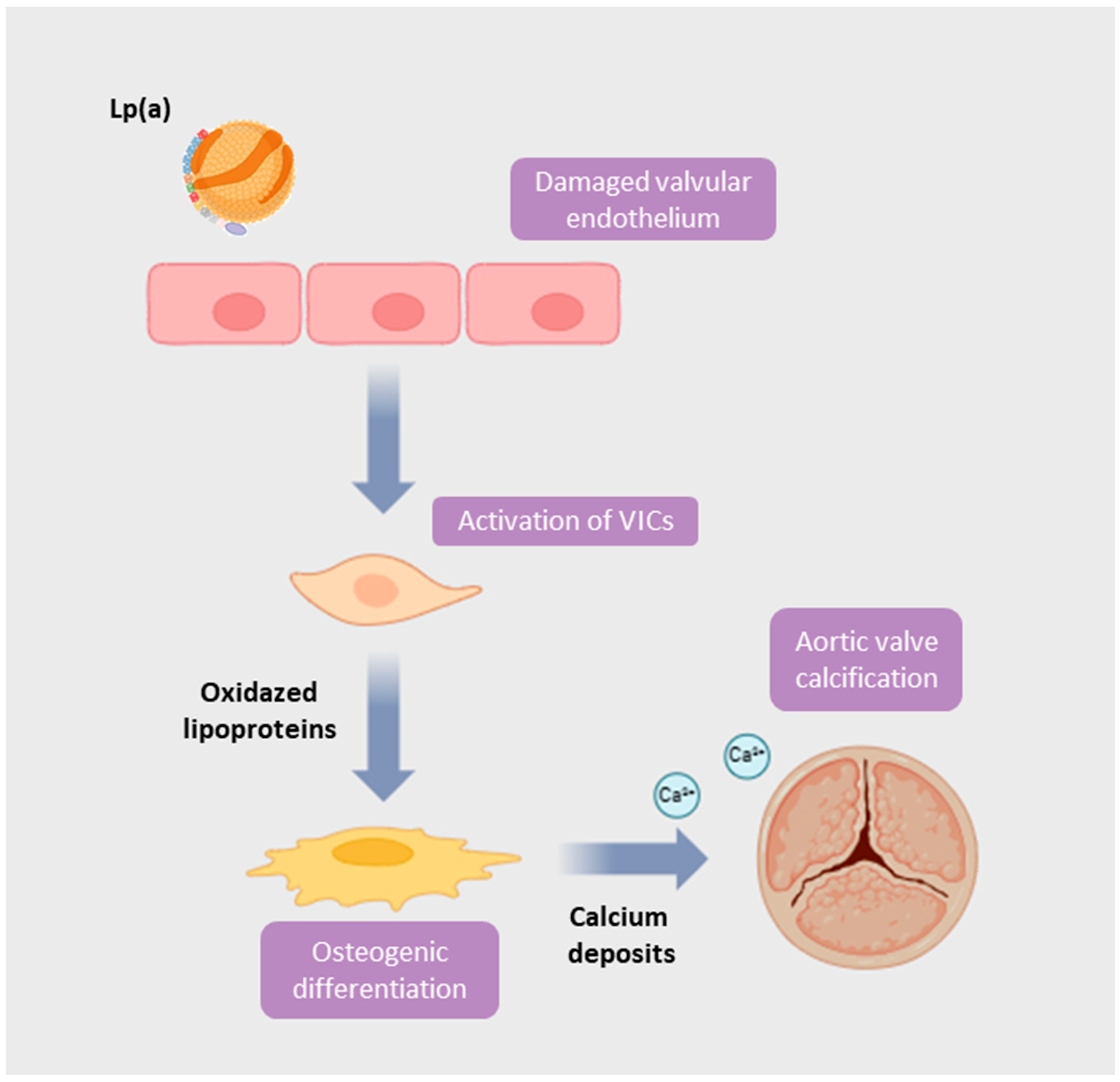 Calcific AVS is the result of a multifactorial process involving lipid accumulation, cell apoptosis, and activation of osteogenic pathways, upon an inflammatory background. Within this intricate network of cellular and molecular interactions, Lp(a) arises as a pro-inflammatory and pro-atherogenic determinant, which contributes to the development of this pathological condition (Figure 2).