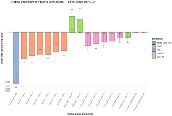 In our pilot study, we analyzed the relationship between the various retinal layers and plasma biomarkers, specifically NfL, GFL, p-tau181, p-tau217, and the Aβ42/40 ratio. These associations reveal early processes connecting retina and brain pathology in “pre-AD” patients. Our analytical approach shows the size effects of each retinal layer at a cross-section of the pre-AD timeline when cognition is still normal. We observe that the outer retinal layers, particularly the photoreceptor inner segment (PR-IS), show early vulnerability to neuroaxonal injury, as reflected by the strong negative association between PR-IS thinning and elevated plasma NfL levels, exhibiting greater structural involvement compared with the inner retinal layers.