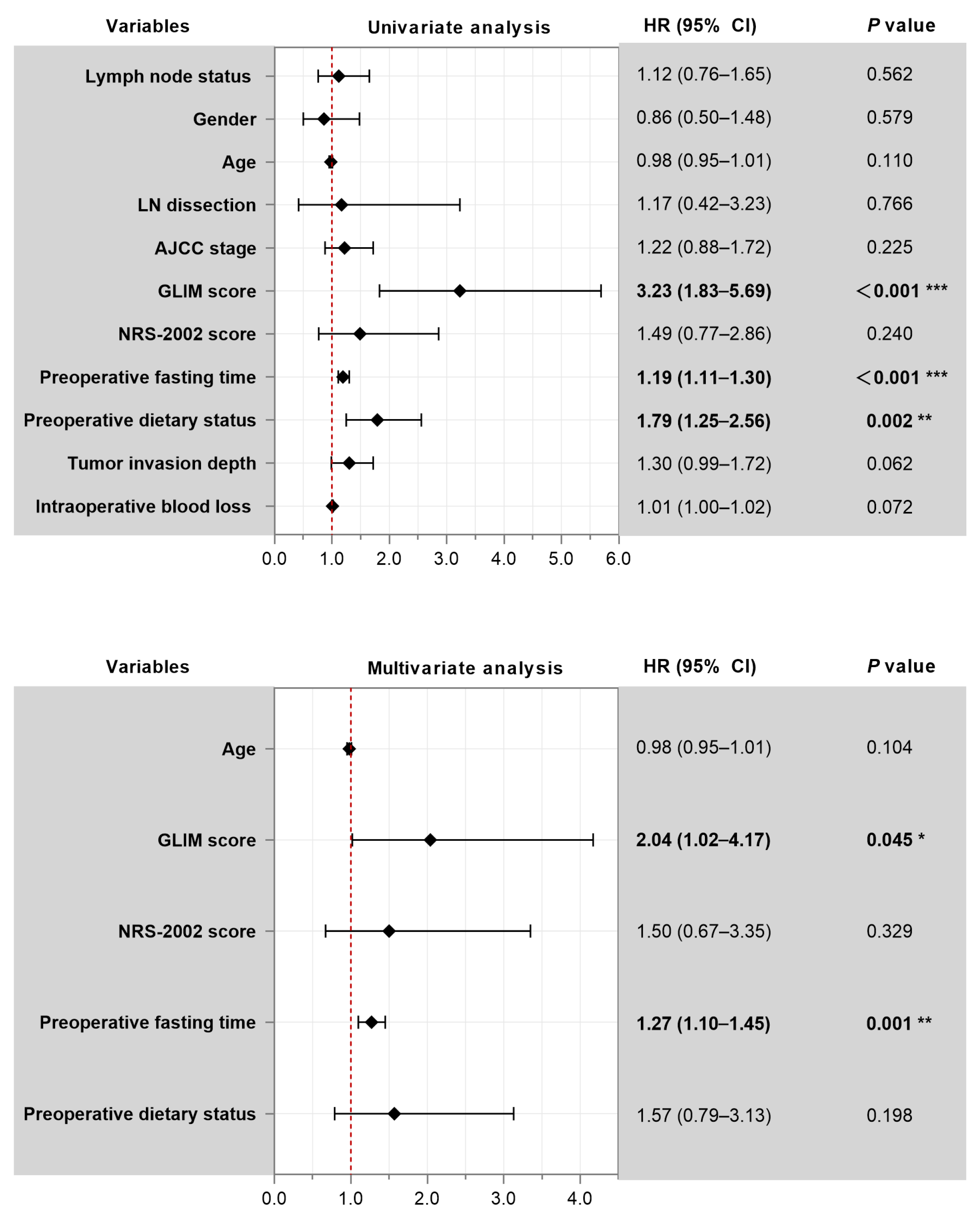 Univariate Cox regression analysis identified several variables associated with an increased risk of prolonged GT retention, including moderate-to-severe malnutrition per GLIM criteria (HR = 3.23, 95% CI: 1.83–5.69, p < 0.001), longer preoperative fasting time (HR = 1.19 per hour, 95% CI: 1.11–1.30, p < 0.001), and worse preoperative dietary status (HR = 1.79, 95% CI: 1.25–2.56, p = 0.002). Tumor invasion depth (HR = 1.30, 95% CI: 0.99–1.72, p = 0.062) and increased intraoperative blood loss (HR = 1.01 per mL, 95% CI: 1.00–1.02, p = 0.072) also showed a trend toward association. We also evaluated lymph node metastasis as a potential predictor; however, it was not significantly associated with prolonged GT retention in our cohort (HR = 1.12, 95% CI: 0.76–1.65, p = 0.562) (Figure 4).