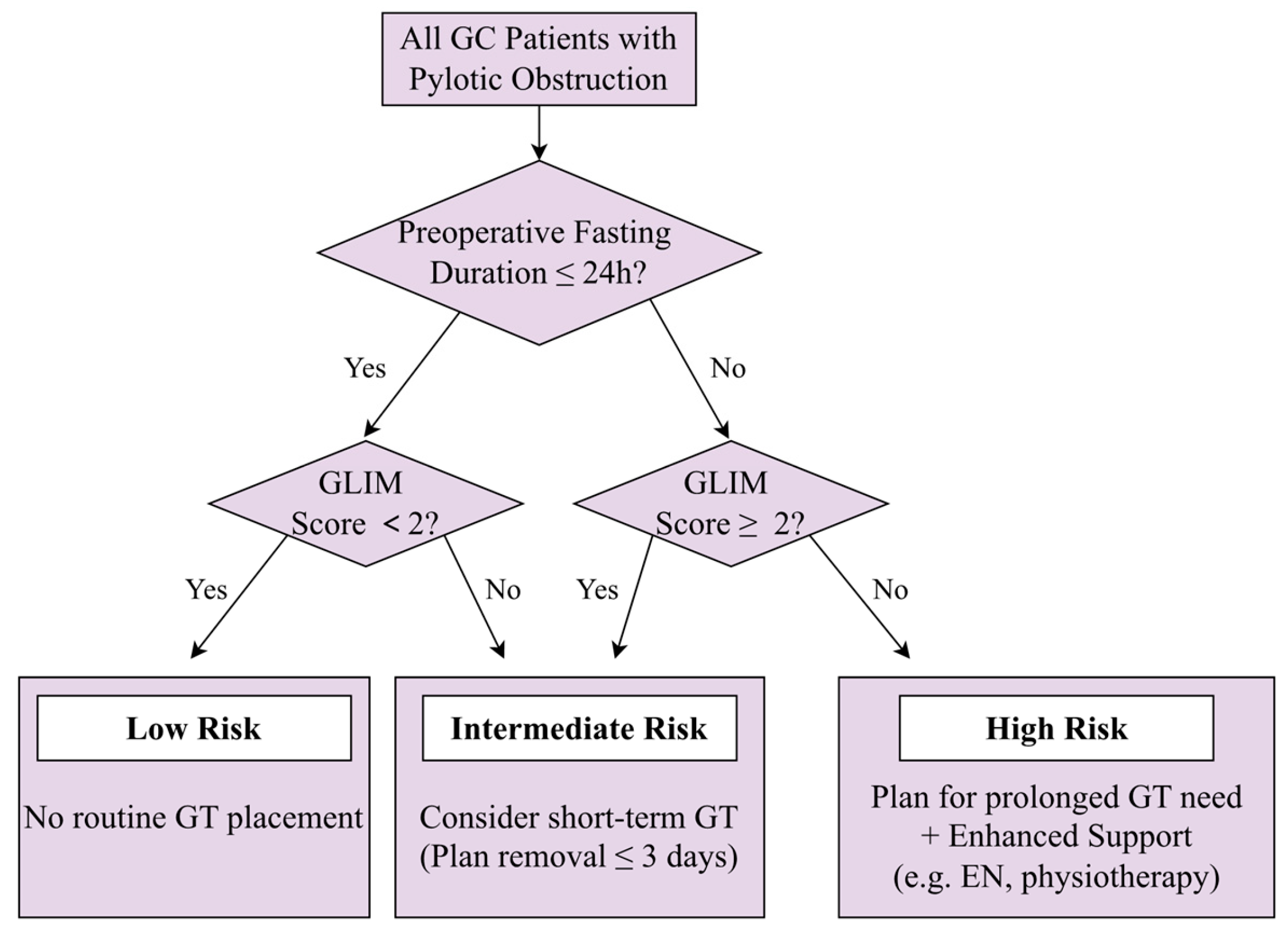 Our approach to selective GT use aligns with a growing trend in gastrointestinal surgery to tailor decompression practices based on patient-specific risk factors. In general gastrectomy populations, several studies have advocated for omitting routine GT placement, with some proposing selective use in cases of extensive resection, high intraoperative blood loss, or suspected anastomotic tension [19,20]. For instance, Li et al. suggested that GT may be beneficial only in patients with prolonged operative time or significant gastric distension, though their criteria were not explicitly validated in obstructed patients [19]. Similarly, in colorectal surgery, selective nasogastric decompression is often guided by factors such as preoperative bowel obstruction, intraoperative contamination, or surgeon judgment [31,32]. However, these strategies lack standardized, easily assessable preoperative predictors, particularly for gastric cancer patients with outlet obstruction. Our study advances this paradigm by identifying two readily available preoperative variables—fasting duration and GLIM-defined malnutrition—that are specifically relevant to this high-risk subgroup. Unlike previous protocols that rely on intraoperative or subjective clinical assessments, our algorithm provides a structured, preoperative framework that can be integrated into ERAS pathways before surgery, facilitating earlier decision-making and resource planning.