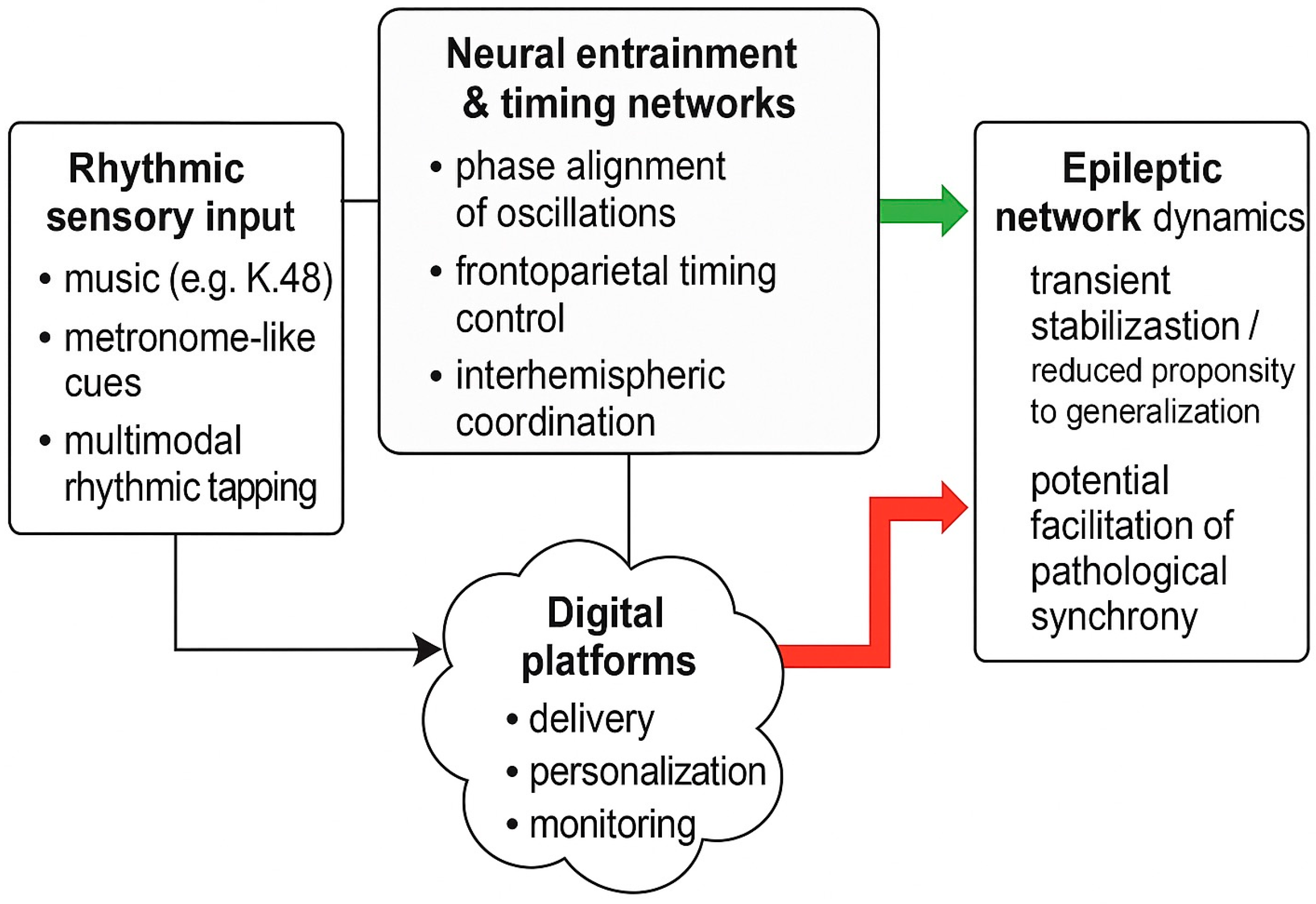 11]. Within this framework, rhythmic input could theoretically stabilize vulnerable circuits by reinforcing more regular phase relationships or improving top-down modulation by prefrontal timing networks—an idea captured in recent systems-level hypotheses of focal epilepsy [