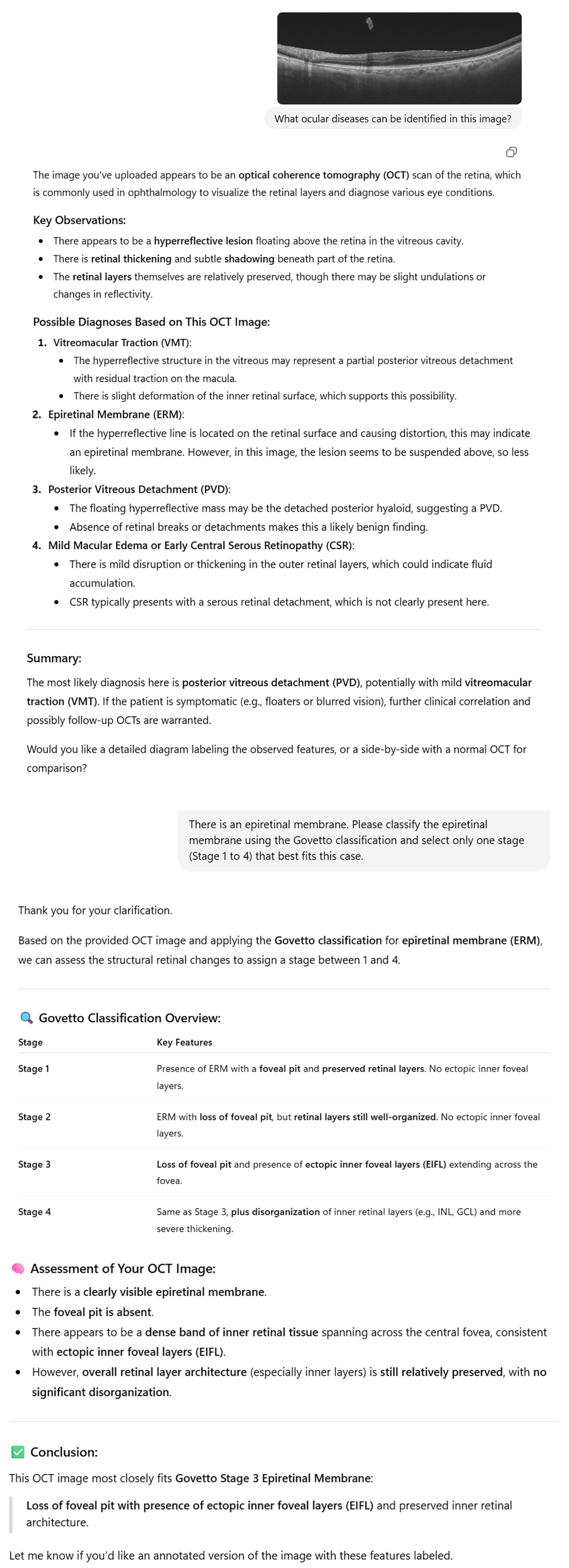 Example of ChatGPT-4o’s Govetto Classification (Stage 3) Based on an OCT Image. Representative optical coherence tomography (OCT) image uploaded to ChatGPT-4o, in which the model identified an epiretinal membrane (ERM) and classified the case as Govetto Stage 3. ChatGPT-4o’s assessment highlights the loss of the foveal pit and the presence of ectopic inner foveal layers (EIFL) spanning across the central macula, while noting relatively preserved inner retinal architecture without severe disorganization. These features meet the criteria of Stage 3 in the Govetto classification system. The structured output generated by ChatGPT-4o, including key observations, differential diagnoses, and classification rationale, is shown.