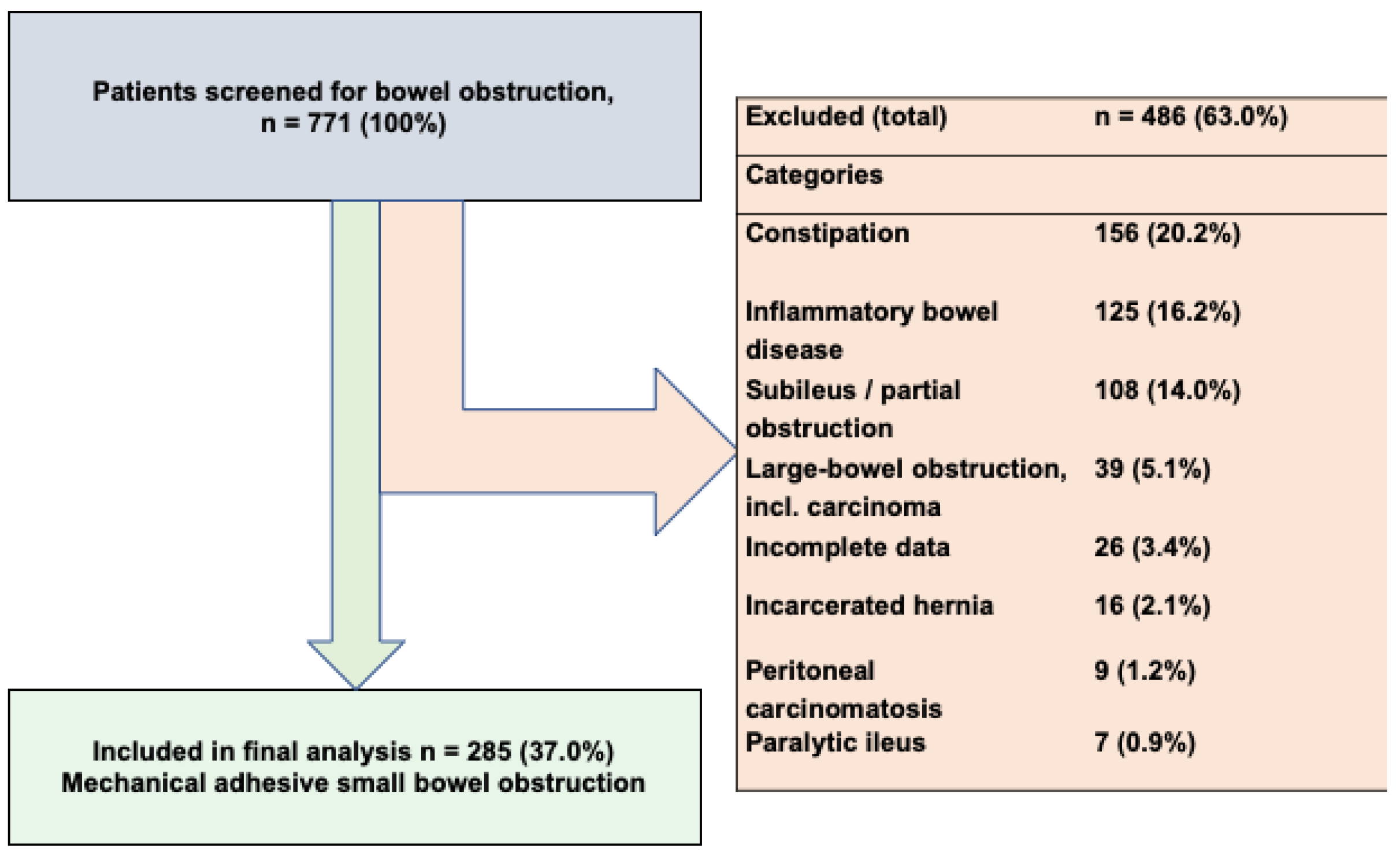 - Maienza, E.; Godiris-Petit, G.; Noullet, S.; Menegaux, F.; Chereau, N. Management of adhesive small bowel obstruction: The results of a large retrospective study. Int. J. Color. Dis. 2023, 38, 224. [Google Scholar] [CrossRef]