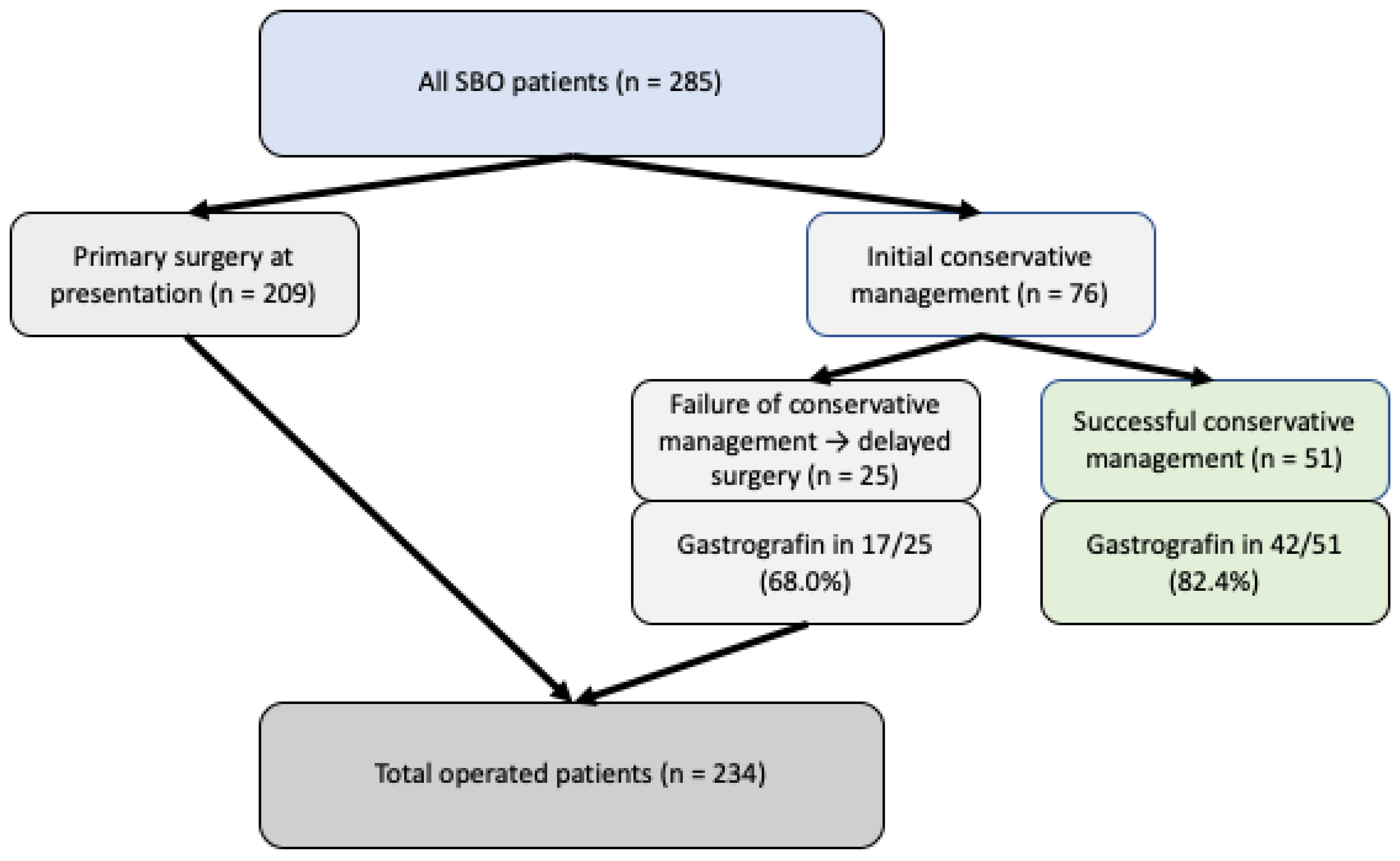 - Ng, Z.Q.; Hsu, V.; Tee, W.W.H.; Tan, J.H.; Wijesuriya, R. Predictors for success of non-operative management of adhesive small bowel obstruction. World J. Gastrointest. Surg. 2023, 15, 1116–1124. [Google Scholar] [CrossRef]