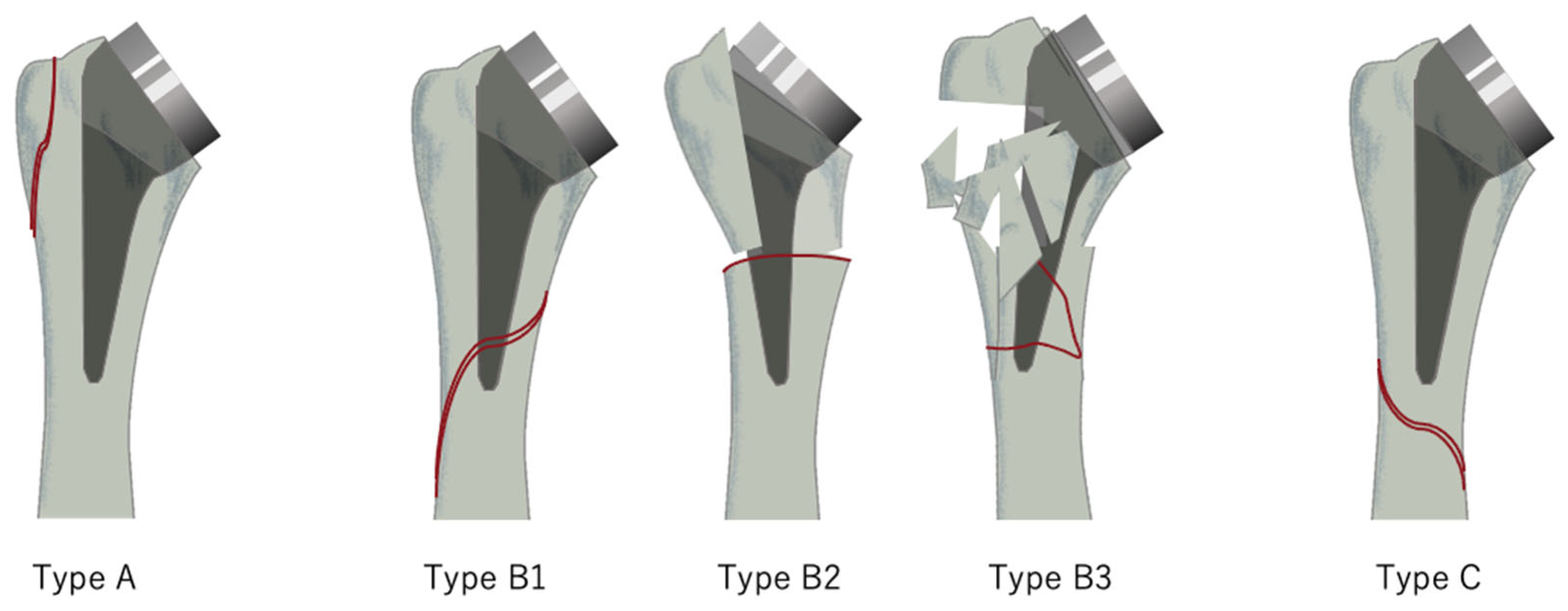 - Duncan, C.P.; Masri, B.A. Fractures of the femur after hip replacement. Instr. Course Lect. 1995, 44, 293–304. [Google Scholar]