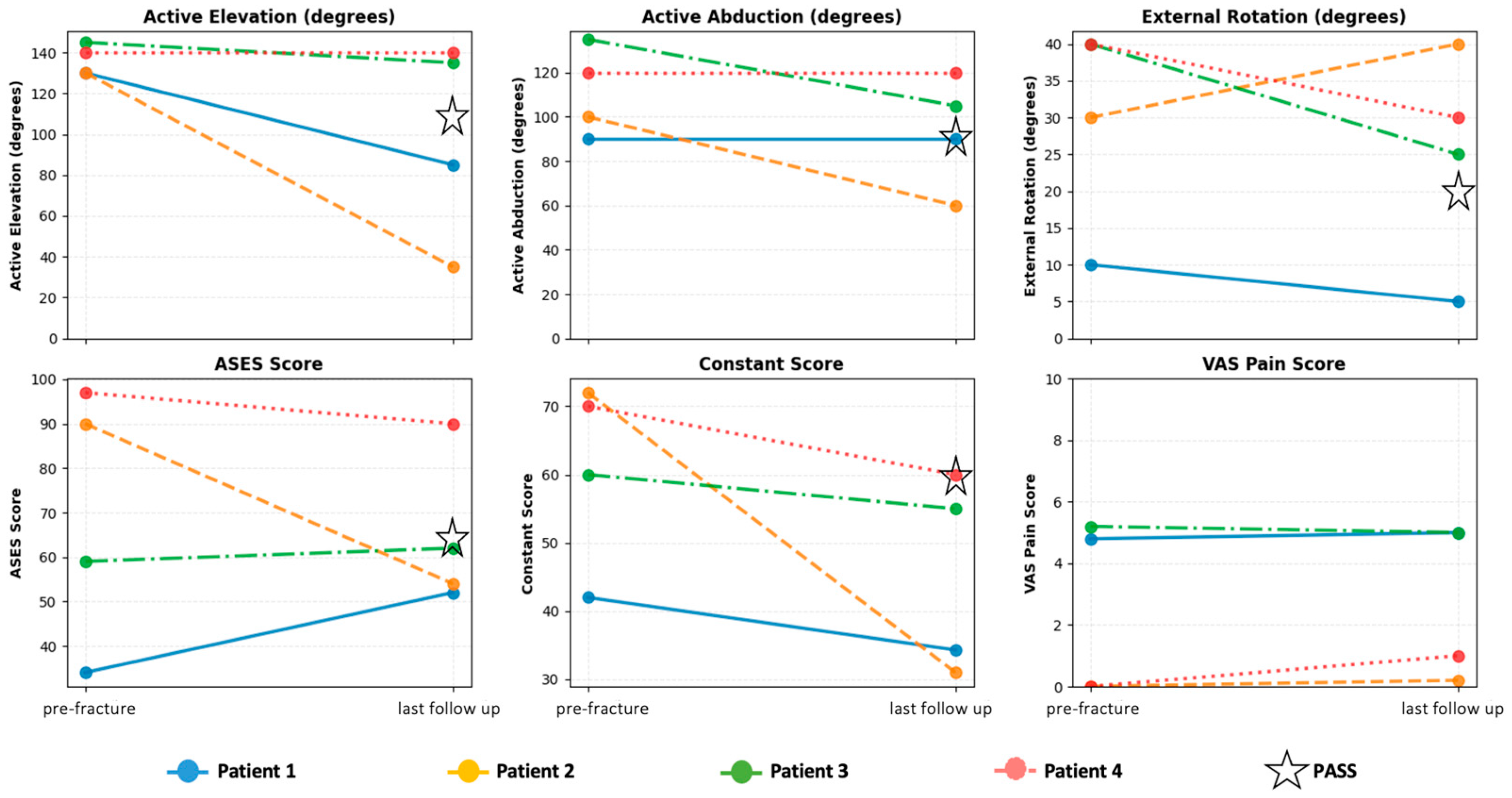 - Hao, K.A.; Hones, K.M.; O’Keefe, D.S.; Saengchote, S.E.; Burns, M.Q.; Wright, J.O.; Wright, T.W.; Farmer, K.W.; Struk, A.M.; Simovitch, R.W. Quantifying success after first revision reverse total shoulder arthroplasty: The minimal clinically important difference, substantial clinical benefit, and patient acceptable symptomatic state. J. Shoulder Elb. Surg. 2023, 32, e516–e527. [Google Scholar] [CrossRef]