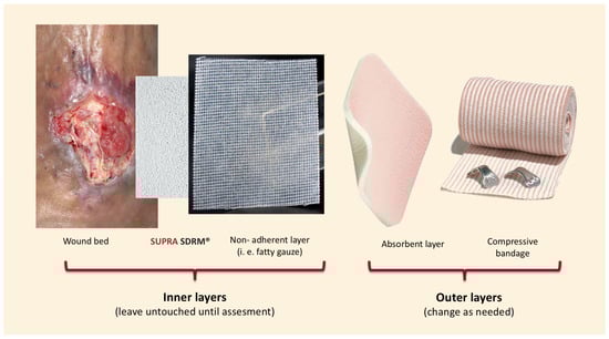 Wound bed preparation included surgical debridement and hemostasis, followed by the application of PLA matrices (Supra SDRM, PolyMedics Innovations, Kirchheim unter Teck, Germany) using the “sandwich technique” (