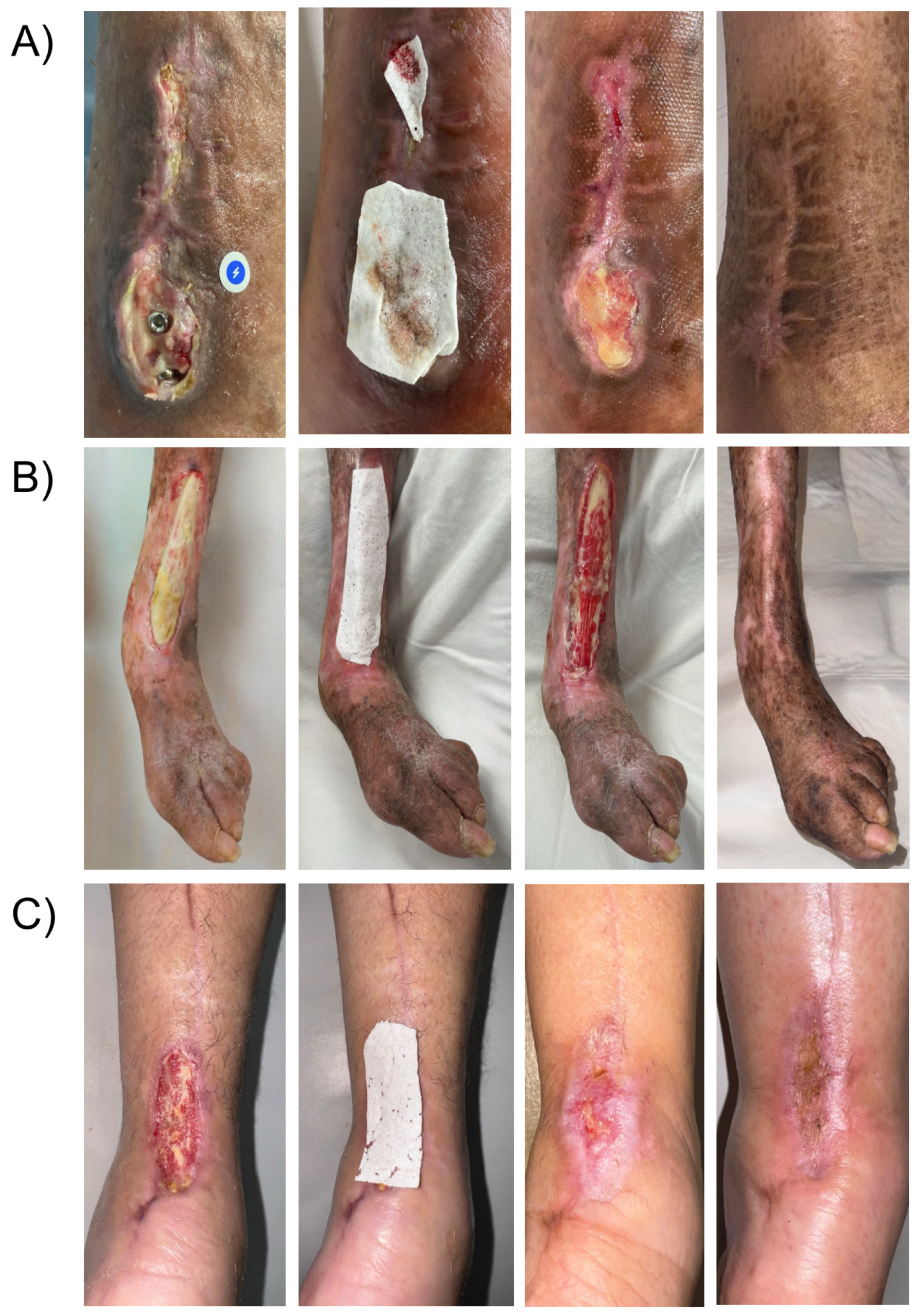 Sequential presentation of lower-leg injuries: (A) tibial fracture wound with osteosynthesis material, (B) friction wound with exposed tendon, and (C) postoperative wound showing Achilles tendon exposure.