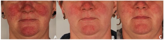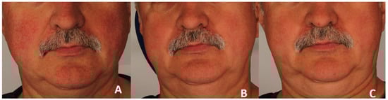 Erythema reduction in patient 1. Panel (A) represents the condition before treatment, panel (B) shows the skin four weeks after completion of three polychromatic light sessions, and panel (C) shows the skin three months after the three-session treatment series.