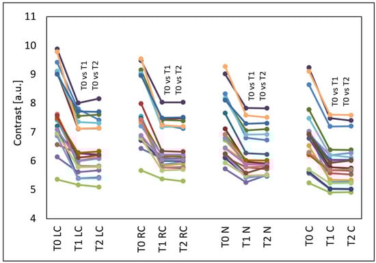 GLCM contrast of the left cheek (LC), right cheek (RC), nose (N) and chin (C) before the treatments (T0), four weeks after three treatments (T1) and three months after three treatments (T2), T0 vs. T1 and T0 vs. T2—statistically significant inter-group differences (post hoc, ANOVA Friedman).