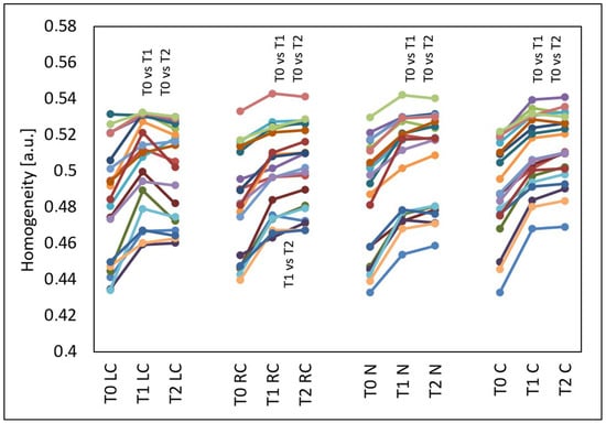 GLCM homogeneity of the left cheek (LC), right cheek (RC), nose (N) and chin (C) before the treatments (T0), four weeks after three treatments (T1) and three months after three treatments (T2), T0 vs. T1 and T0 vs. T2 and T1 vs. T2—statistically significant inter-group differences (post hoc, ANOVA Friedman).