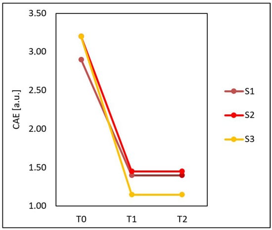 Compared to the time before treatments (T0), at four weeks after three treatments (T1), the median CAE decreased by 61.11% from 3.10 to 1.30 and remained the same at three months after three treatments (T2).