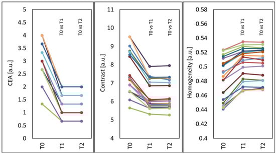 Mean CEA, GLCM contrast and GLCM homogeneity of the face before treatments (T0), four weeks after three treatments (T1) and three months after three treatments (T2), T0 vs. T1 and T0 vs. T2—statistically significant inter-group differences (post hoc, ANOVA Friedman).