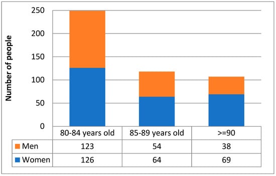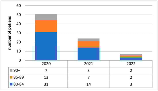 Between 2018 and 2022, 4045 patients were hospitalized in the ICUs of PIM MSWiA, of whom 476 (11.77%) were aged ≥80 years. Within this group, the largest proportion of patients was 80–84 years old (n = 249; 52.3%), while a minority were patients 85–89 years old (n = 120; 25.2%) and over 90 years old (n = 107;22.5%). The entire group of patients aged ≥80 years, as well as each age subgroup, was dominated by women; the female preponderance was greatest among patients over 90 (Figure 1, Table 1). Among patients aged 80+, women were significantly older than men (median [range] ages were 85 [80–103] years in women and 84 [80–98] years in men, p = 0.021). In the analyzed time frame, a gradual decrease in the number of elderly patients hospitalized in the ICU can be observed in successive calendar years (Figure 2).
