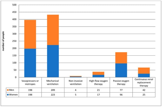 In the analyzed group of patients, intensive treatment methods were used in the form of conventional (invasive) mechanical ventilation (n = 432; 90.8%), non-invasive ventilation (n = 9; 1.9%), high-flow oxygen therapy (n = 38; 8.0%), cardiovascular support with infusion of catecholamines (n = 396; 83.2%), and renal replacement therapy (n = 67;14.1%) by continuous veno-venous hemodialysis or hemodiafiltration. Detailed data are shown in Table 1 and Figure 6.