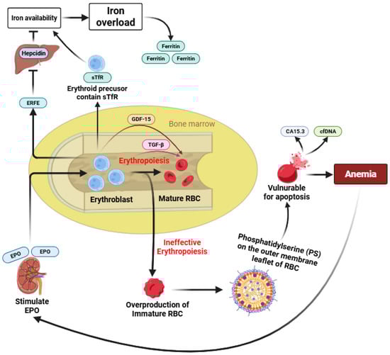 Under normal conditions, erythropoiesis results in the maturation of erythroblasts into functional mature RBCs [1]. In β-thalassemia, reduced or absent β-globin chain synthesis leads to IE, a complex process that remains incompletely understood, characterized by erythroid expansion with impaired maturation and increased intramedullary destruction [8]. As a consequence, immature and structurally abnormal erythrocytes accumulate and exhibit phosphatidylserine (PS) externalization on the cell membrane, triggering eryptosis and accelerated clearance, thereby contributing directly to anemia [33]. Enhanced apoptosis and intramedullary destruction of erythroid precursors are associated with increased release of circulating biomarkers such as CA15.3 and cfDNA [31,38]. Chronic anemia stimulates renal EPO production, which drives expansion of erythroid progenitors and induces ERFE secretion from erythroblasts [39]. Elevated ERFE suppresses hepatic hepcidin expression, leading to increased iron availability in the circulation. Concurrently, expanded erythroid mass expresses higher levels of sTfR, further enhancing iron uptake [40]. The combined effects of increased iron absorption and utilization result in progressive iron overload, reflected by elevated serum ferritin levels. In parallel, erythroid stress and expanded but ineffective erythropoiesis promote increased expression of GDF-15 across early to late stages of erythroid differentiation, with additional involvement of TGF-β signaling during late erythroid maturation [32]. Together, these interconnected pathways illustrate how alterations in multiple biomarkers reflect different yet overlapping aspects of ineffective erythropoiesis, iron dysregulation, and premature erythrocyte death in β-thalassemia (Figure 2).