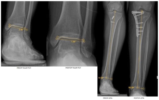 Preoperative and postoperative radiographic images demonstrating ankle joint measurements, including talar tilt and lateral distal tibial angle (LDTA).