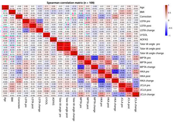 A significant positive correlation was found between the amount of correction and the change in the HKA (r = 0.48, p < 0.001). A significant negative correlation was also observed between the amount of correction and the change in the JLCA (r = –0.32, p < 0.01). Additionally, there was no statistically significant correlation between the percentage change in talar tilt and the change in the LDTA.