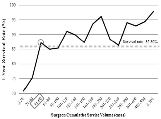 In summary, this study was the first to examine surgeon cumulative service volume in liver transplantation at a population level and to describe its association with 1-year post-transplant survival as a representation of the surgical learning curve. The results demonstrated that 1-year survival after liver transplantation tended to increase with higher surgeon service volume (relative volume). When surgeons had accumulated approximately 41–60 liver transplant cases, patient 1-year survival reached approximately 85% and became more stable.
