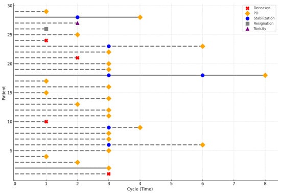 In the study group, seven patients received only one cycle of regorafenib, five received two cycles, twelve received three cycles, and five continued therapy beyond three cycles. Twenty-three patients discontinued treatment due to disease progression, while one patient discontinued due to treatment-related toxicity. Four patients died before disease progression could be confirmed. One patient voluntarily withdrew from treatment. The treatment course is illustrated in Figure 1.
