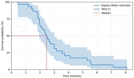Statistical analyses were performed to evaluate PFS and OS within a time-to-event framework. PFS was defined as the time from the start of treatment until disease progression or death from any cause, whichever occurred first. OS was defined as the time from the start of treatment until death from any cause. Patients who were alive at the last follow-up were censored at that time. The analysis included the calculation of median values of PFS and OS, along with the comparison of survival curves using Kaplan–Meier estimation. Data visualization was generated using Python (version 3) with the Matplotlib v3.10 and Lifelines v0.30 libraries.