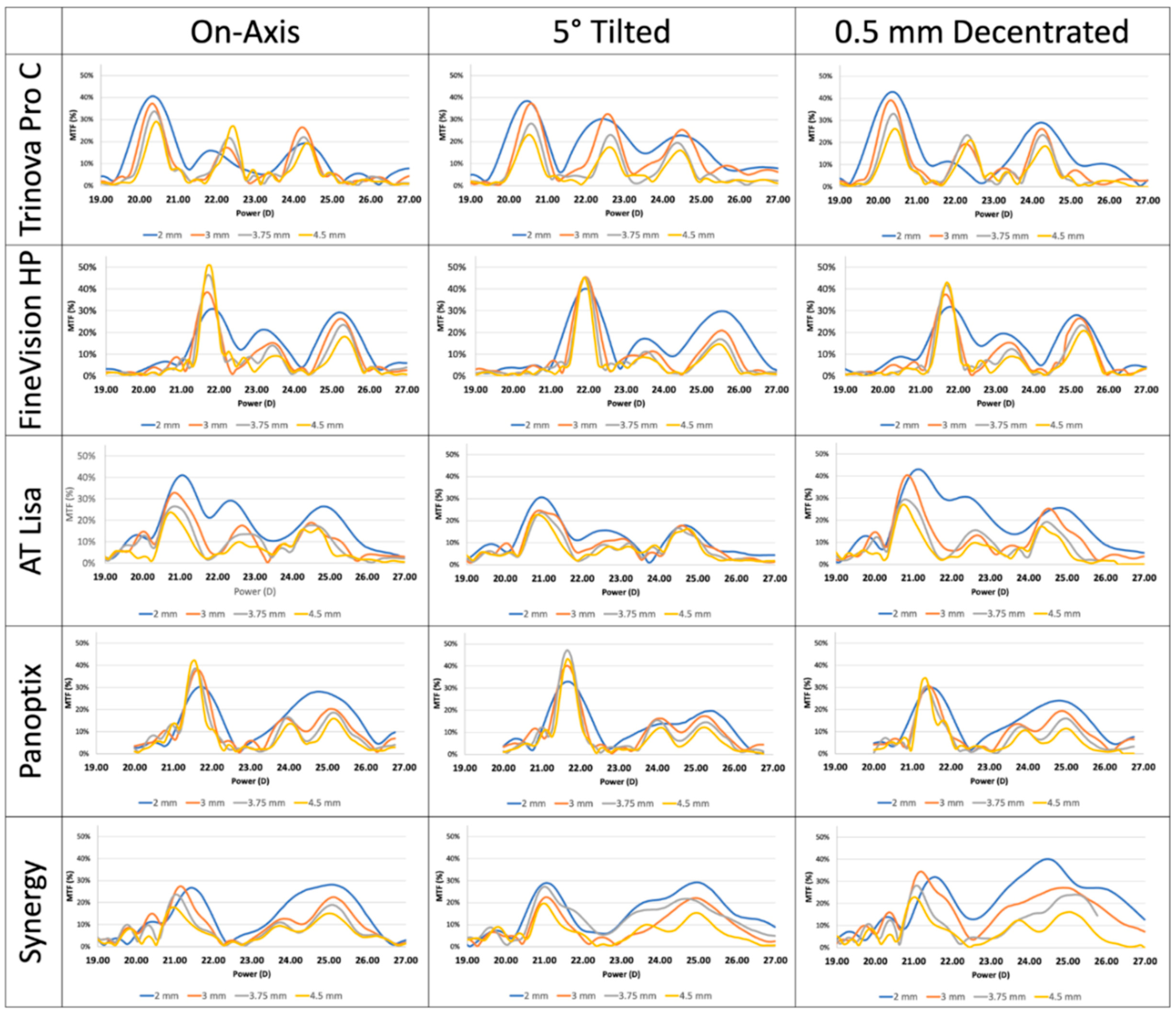- Tandogan, T.; Son, H.S.; Choi, C.Y.; Knorz, M.C.; Auffarth, G.U.; Khoramnia, R. Laboratory Evaluation of the Influence of Decentration and Pupil Size on the Optical Performance of a Monofocal, Bifocal, and Trifocal Intraocular Lens. J. Refract. Surg. 2017, 33, 808–812. [Google Scholar] [CrossRef] [PubMed]