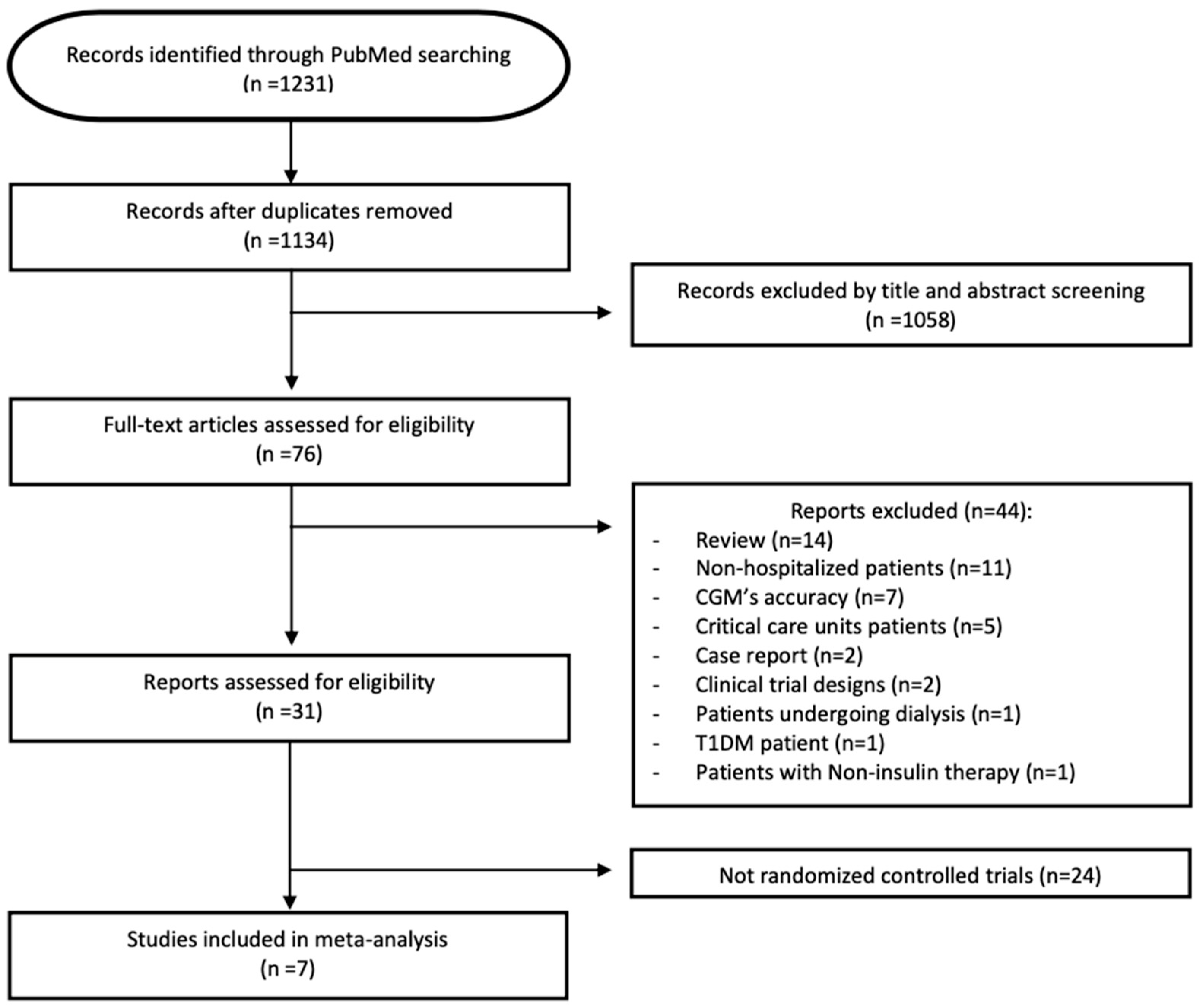 - Studies that did not evaluate patients under insulin treatment, since inpatient glycemic protocols rely on scheduled insulin therapy and the effect of CGM cannot be meaningfully assessed in the absence of insulin-based management.