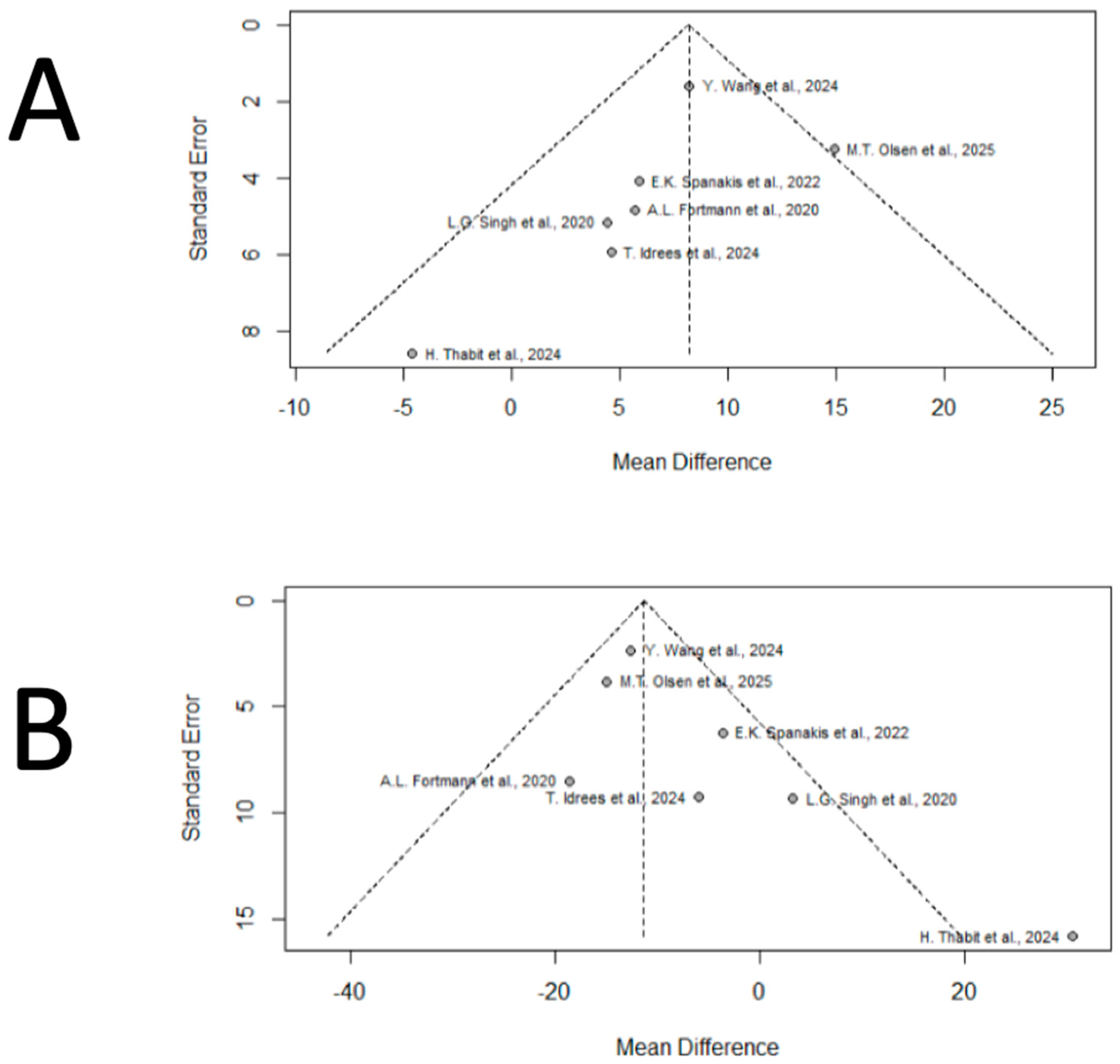 - Sterne, J.A.C.; Sutton, A.J.; Ioannidis, J.P.A.; Terrin, N.; Jones, D.R.; Lau, J.; Carpenter, J.; Rücker, G.; Harbord, R.M.; Schmid, C.H.; et al. Recommendations for examining and interpreting funnel plot asymmetry in meta-analyses of randomised controlled trials. BMJ 2011, 343, d4002. [Google Scholar] [CrossRef]