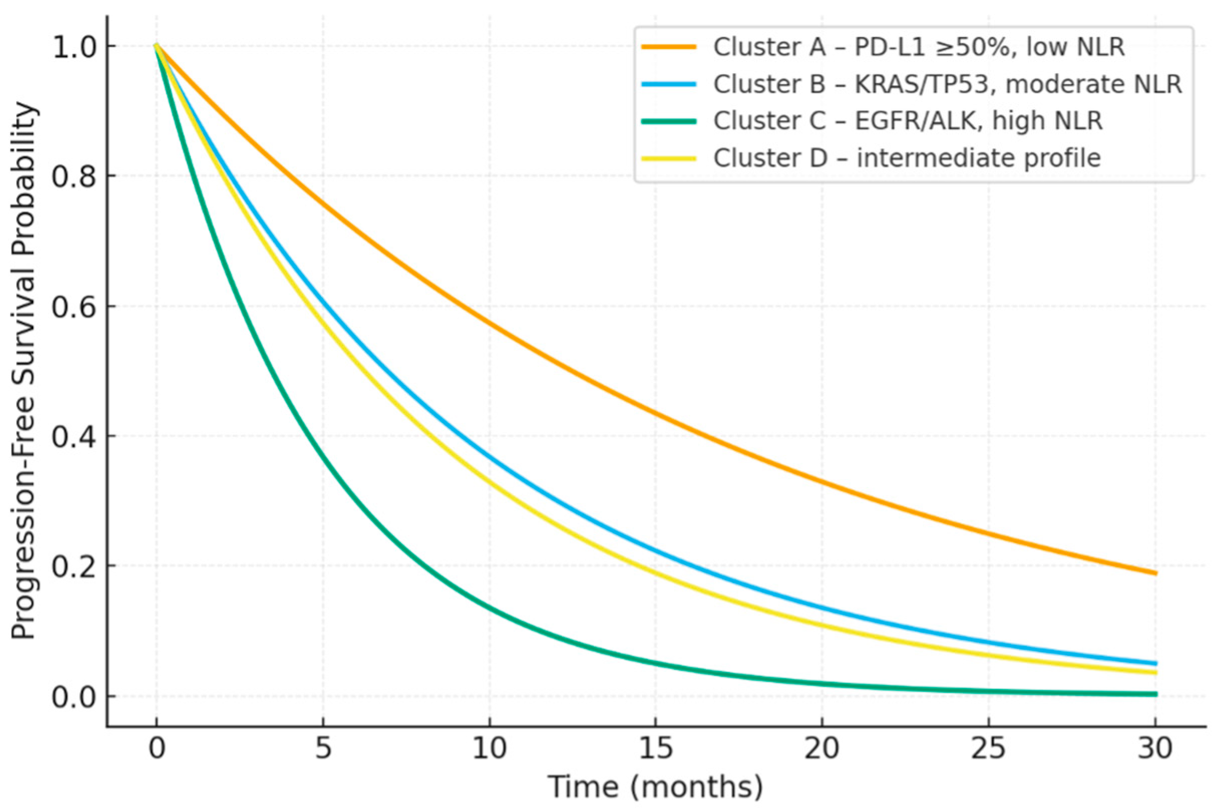 | Cluster | PD-L1 Profile | Dominant Molecular Alterations | Median NLR | Median LMR | Patients (n, %) |