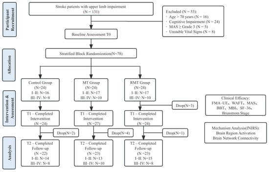This study was designed as a prospective, randomized, controlled, single-blind trial (assessor-blinded). Participants were randomly assigned to a control group, an MT group, or an RMT group. Assessments were conducted at baseline (T0), post-intervention (T1,3 weeks), and follow-up (T2,1 month). The trial flow diagram is shown in Figure 1.