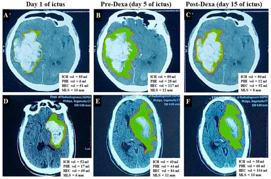 CT scan shows change in volumes of intracerebral hematoma (ICH), hematoma–edema complex (HEC), perihematoma edema (PHE) [Green shaded area represents PHE], and midline shift (MLA). (A–C) Cranial CT images are of a 75-year-old male with primary supratentorial ICH (PSICH) and show the effect of dexamethasone. There is increase in the volumes of ICH, PHE, HEC, and MLS on the second CT (B) compared to baseline (A). The HEC, PHE, and MLS decreased on the day-15 CT scan (C–E), and (F) presents the CT scan image of a 72-year-old male with PSICH who did not receive dexamethasone. There is a reduction in the ICH volume, but the HEC and PHE increased on day 15.