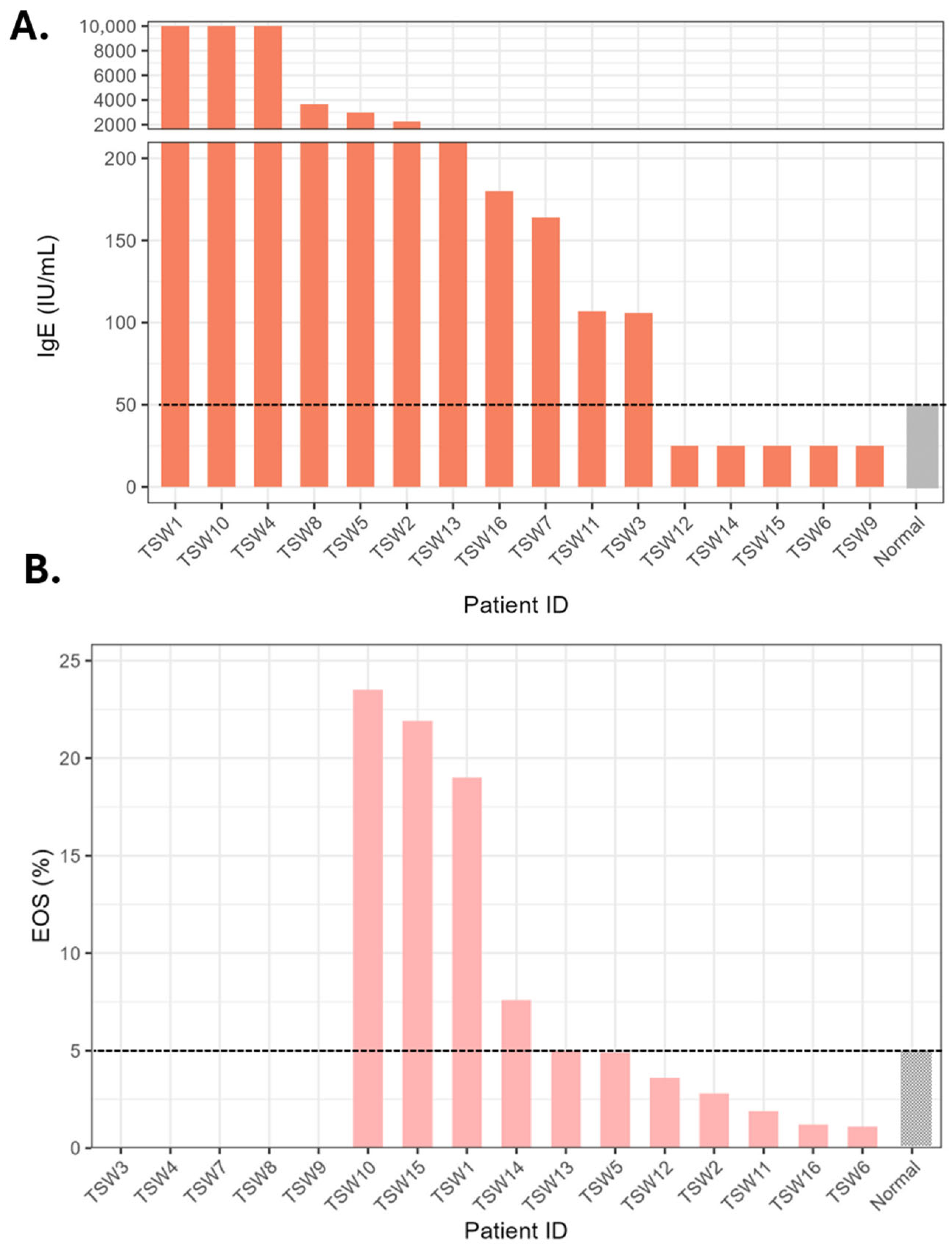- Martins, T.B.; Bandhauer, M.E.; Bunker, A.M.; Roberts, W.L.; Hill, H.R. New childhood and adult reference intervals for total IgE. J. Allergy Clin. Immunol. 2014, 133, 589–591. [Google Scholar] [CrossRef]