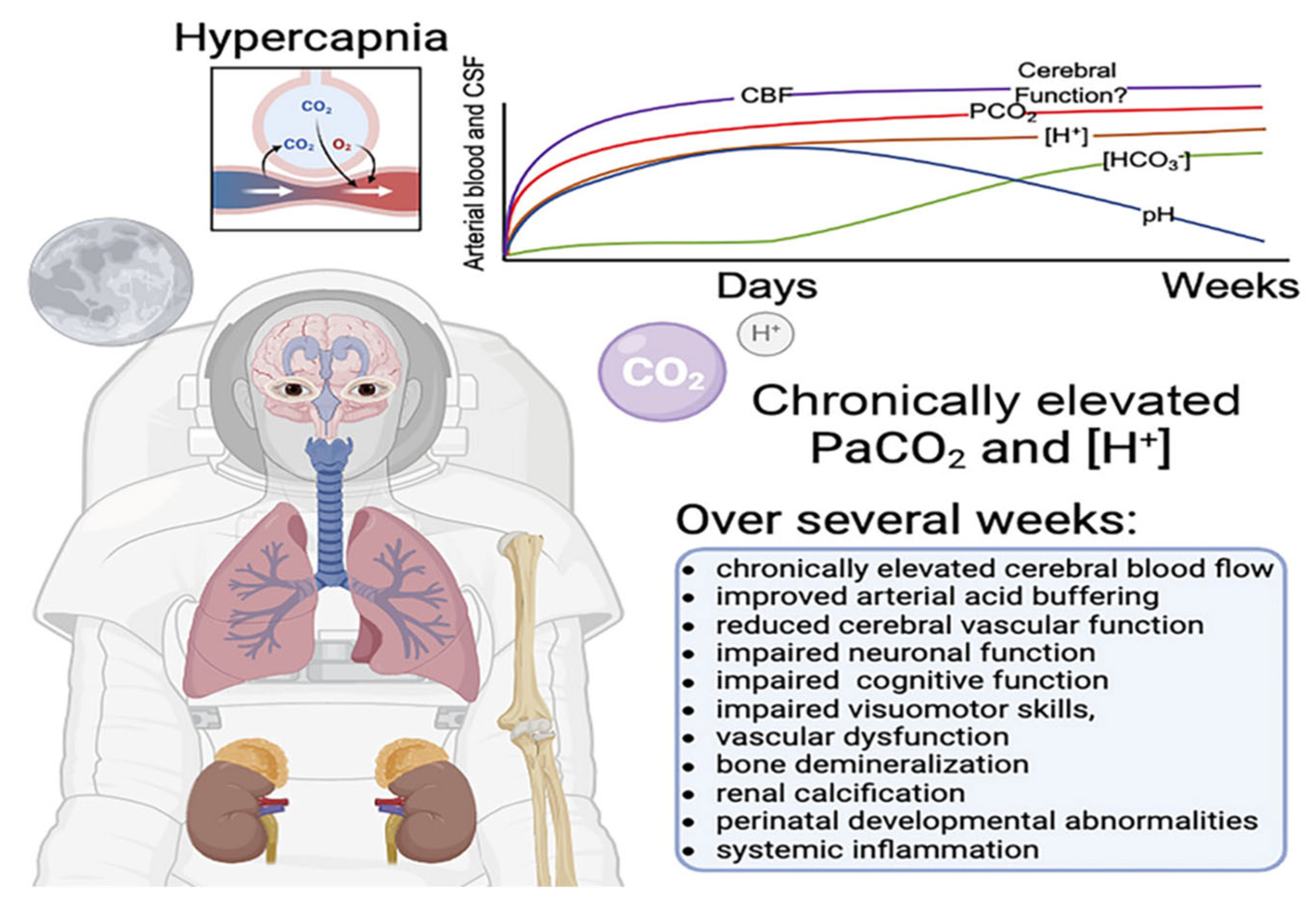 - Carr, J.M.J.R.; Ainslie, P.N.; Day, T. Confined spaces in space: Cerebral implications of chronic elevations of inspired carbon dioxide and implications for long-duration space travel. Exp. Physiol. 2025; Advance online publication. [Google Scholar] [CrossRef]