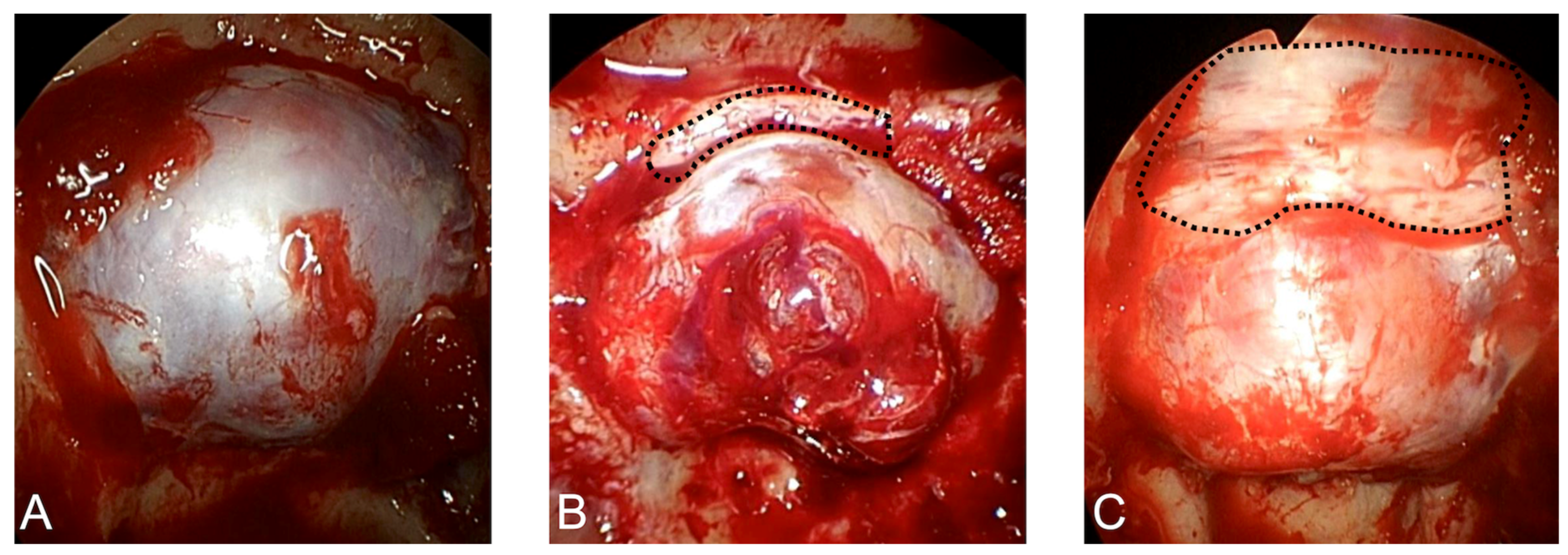 - Reyes Medina, B.; Linsler, S.; Saffour, S.; Sitoci-Ficici, K.H.; Oertel, J. Dural repair after intraoperative CSF leakage in endoscopic endonasal skull base surgery without pedicled nasoseptal flap: Is it a safe surgical technique? Neurosurg. Rev. 2025, 48, 671. [Google Scholar] [CrossRef] [PubMed]
