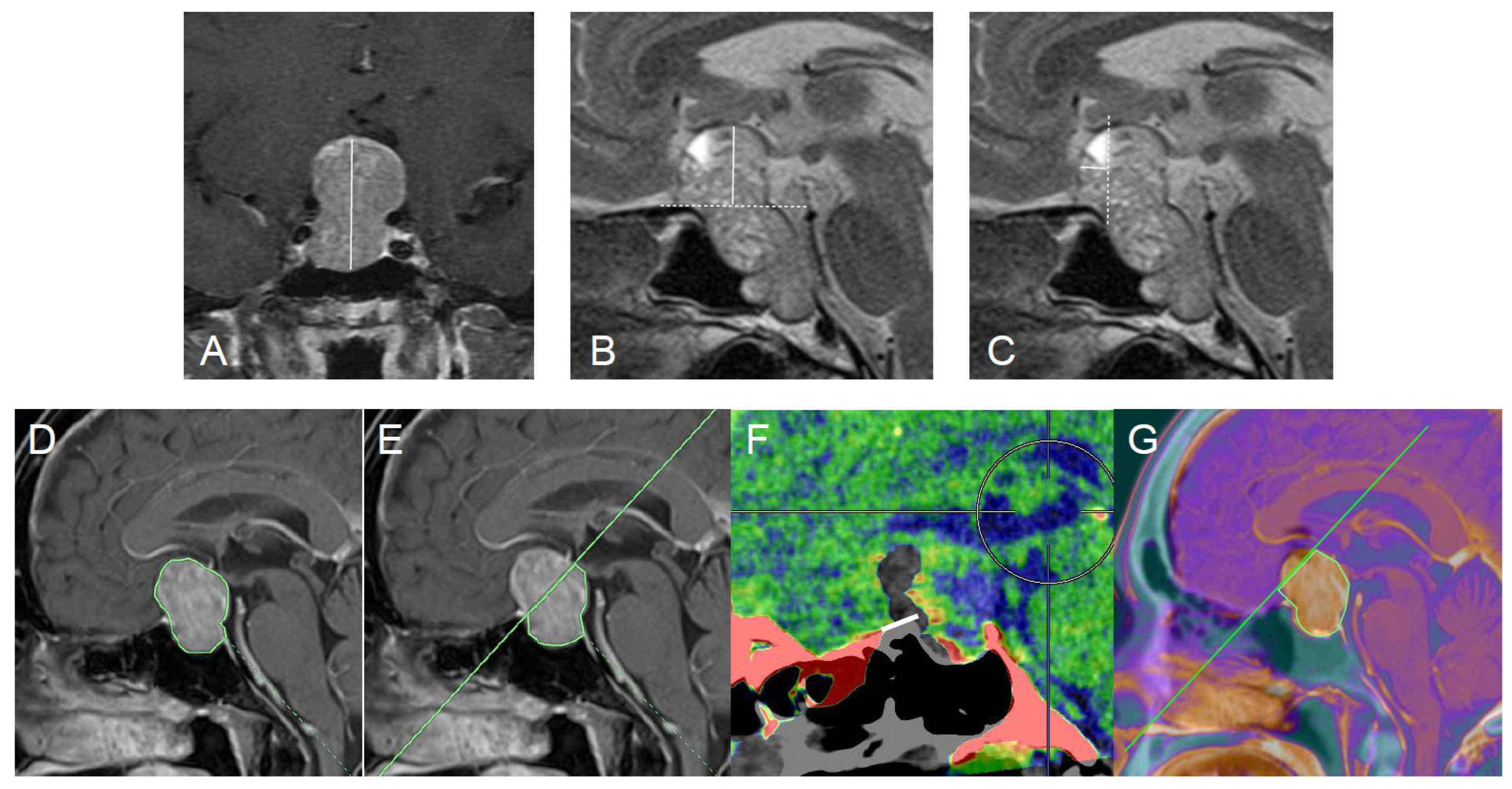 - Micko, A.S.G.; Keritam, O.; Marik, W.; Strickland, B.A.; Briggs, R.G.; Shahrestani, S.; Cardinal, T.; Knosp, E.; Zada, G.; Wolfsberger, S. Dumbbell-shaped pituitary adenomas: Prognostic factors for prediction of tumor nondescent of the supradiaphragmal component from a multicenter series. J. Neurosurg. 2021, 137, 609–617. [Google Scholar] [CrossRef]