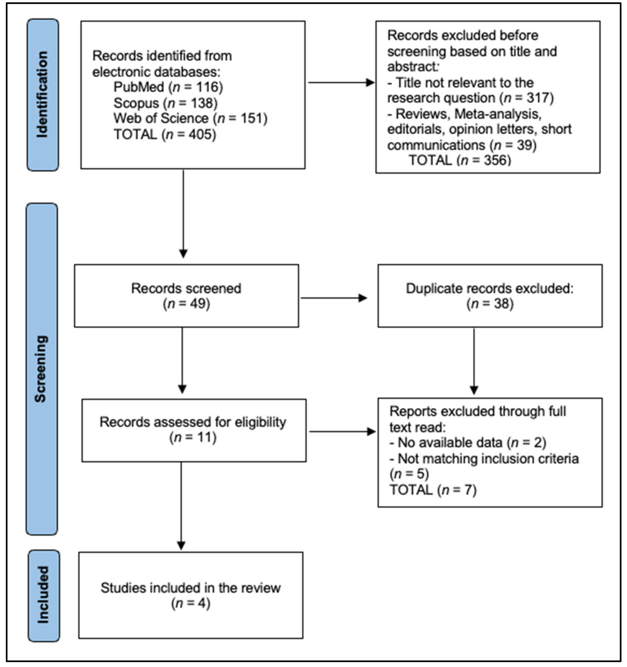 The PRISMA flowchart illustrates the selection process for studies included in the review. An initial search of electronic databases identified 405 records (PubMed