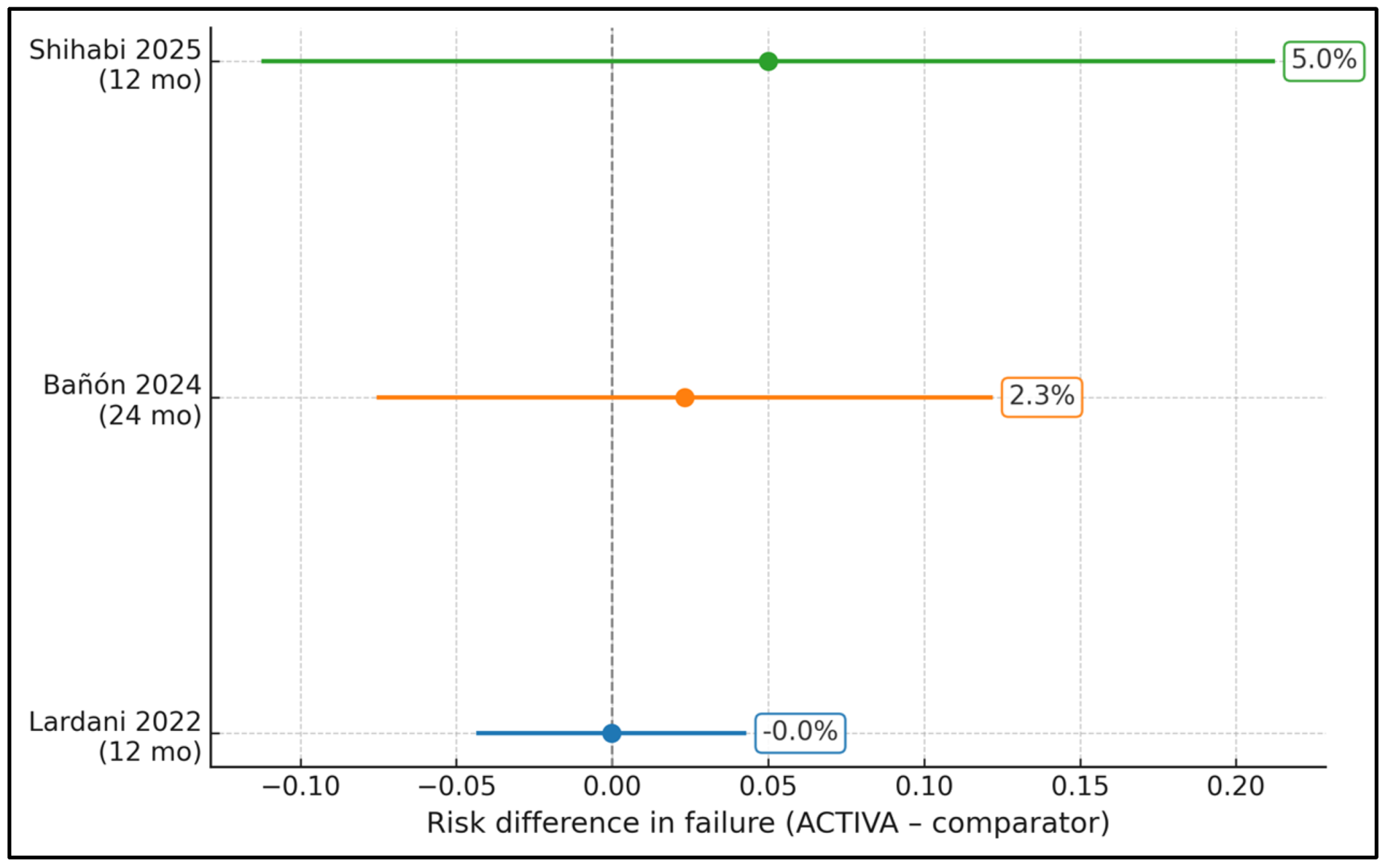 Figure 2 shows the absolute risk difference in failure between ACTIVA and its comparator in each randomized trial, expressed as ACTIVA minus comparator. In Lardani’s study [
