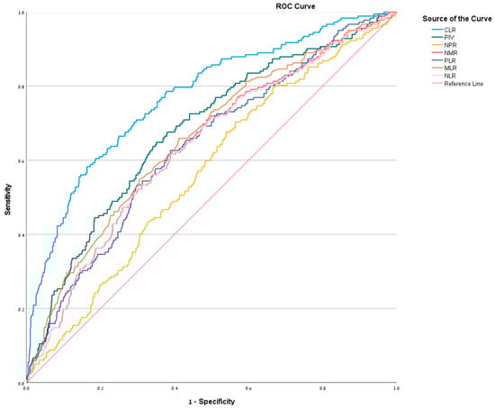 ROC curve for NLR, MLR, PLR, NMR, NPR, PIV, and CLR—illustrates graphically the relationship between true-positive rate (sensitivity) and false-positive rate (1-specificity).