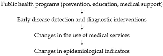 The conceptual framework of the study presents a hypothetical path in which the implementation of public health programs targeted at seniors influences health indicators and the utilization of medical services. The assumption is that preventive and educational programs can lead to early disease detection, enabling earlier diagnostic and therapeutic interventions. Early diagnosis results in differentiation of cases in terms of disease severity and duration of hospitalization. Consequently, this may influence hospitalization patterns, reimbursement costs, and observed epidemiological indicators in the senior population. A written outline of the impact of public health interventions on health indicators and the utilization of medical services is presented below (Figure 1).