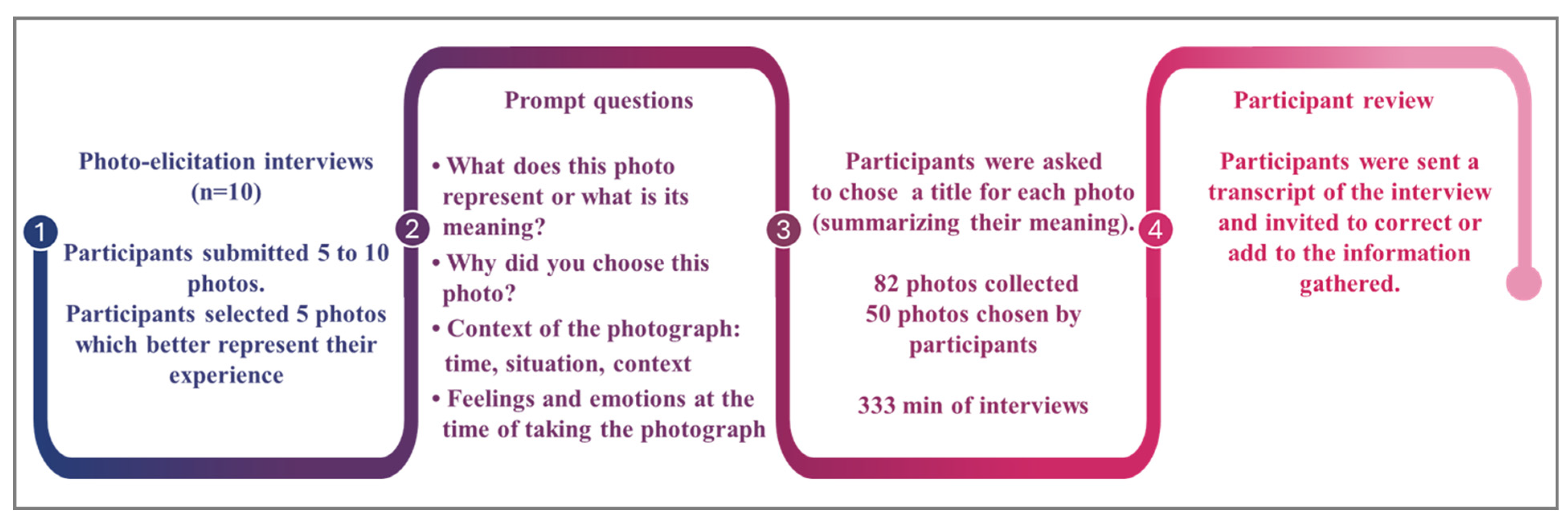 - Church, S.; Quilter, J. Consideration of Methodological Issues When Using Photo-Elicitation in Qualitative Research. Nurse Res. 2021, 29, 25–32. [Google Scholar]