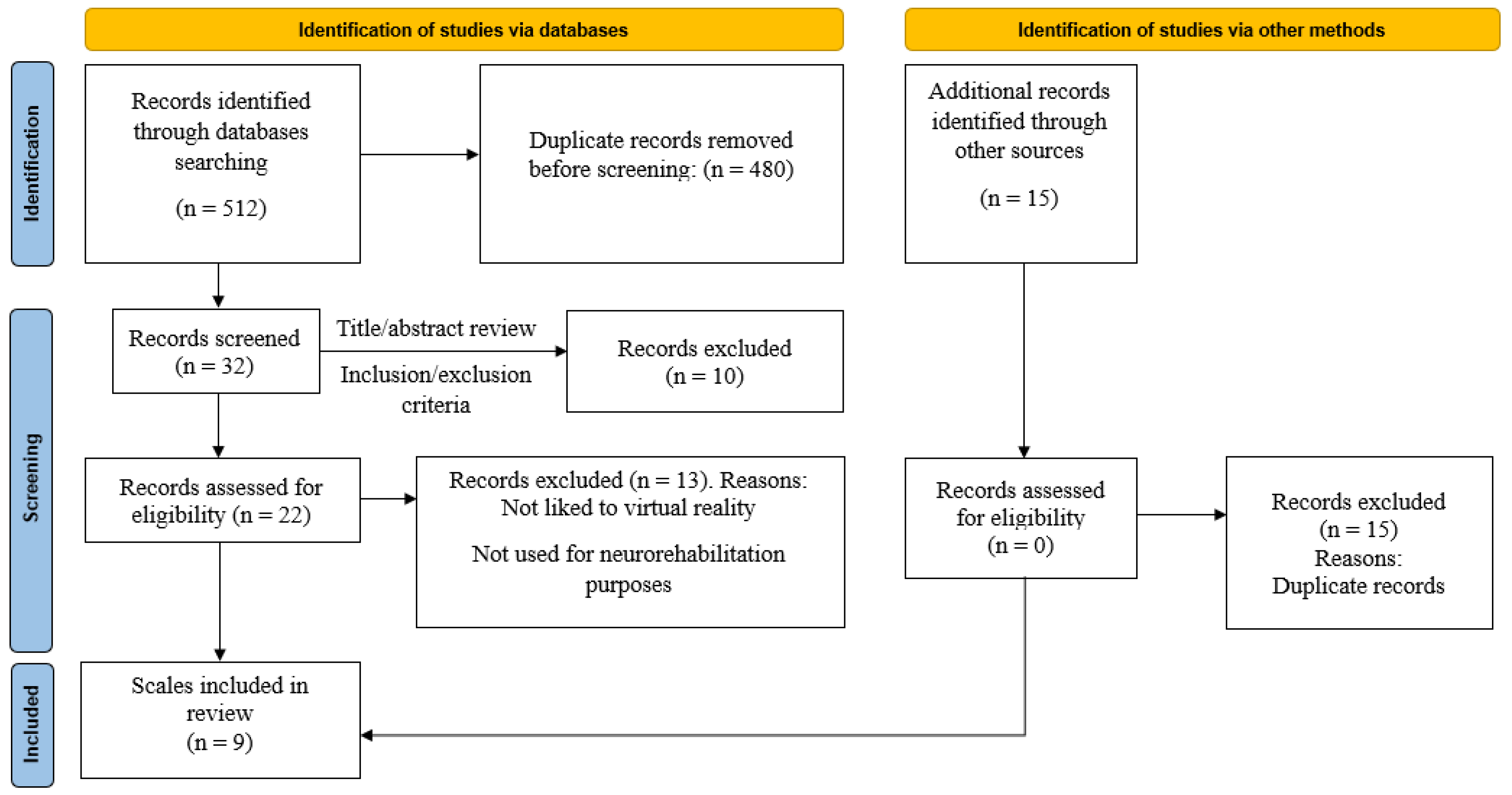 | SEQ [37] | Expert-developed items for VR rehab | No formal study | Not reported | α | Not tested | Not tested | Not tested | Not tested | Preliminary group comparisons | Not tested |